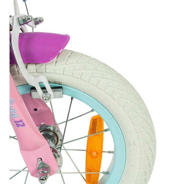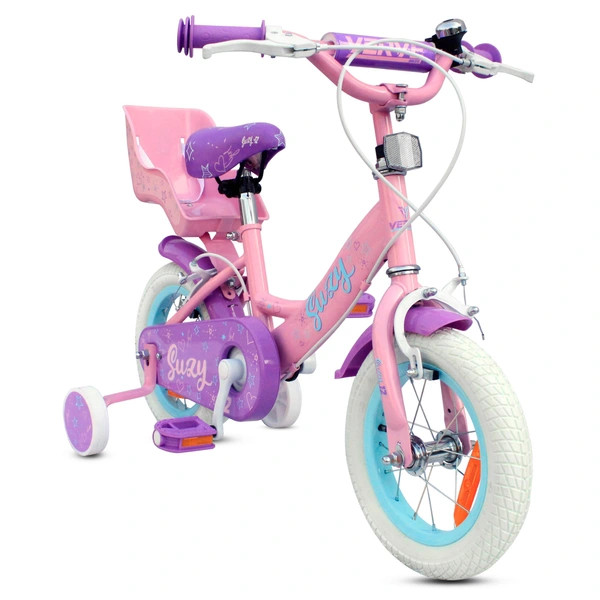 közé tartozik a BMX stílusú keresztrúd a kormányon és a stílusos fehér gumiabroncsok. A villa nyomórugós és rövid műanyag sárvédőkkel rendelkezik konzolok nélkül. A 12 hüvelykes Suzy gyerekkerékpár pótkerekekkel, csengővel, első és hátsó fényvisszaverőkkel, küllőfényekkel, babaüléssel és párnázással van felszerelve a kormány kereszteződésében.