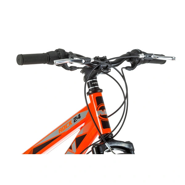 Fedezd fel a természetet ezzel a világos és vagány, 24 hüvelykes, narancssárga Rock gyerek mountain bike-kal! Ez a MTB 21 sebességes hajtáslánccal, sima felfüggesztéssel és pneumatikus gumiabroncsokkal rendelkezik.