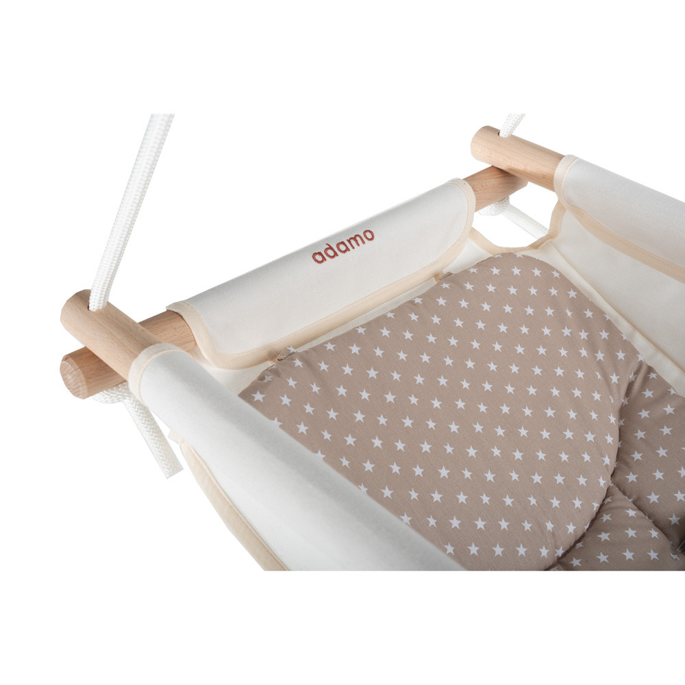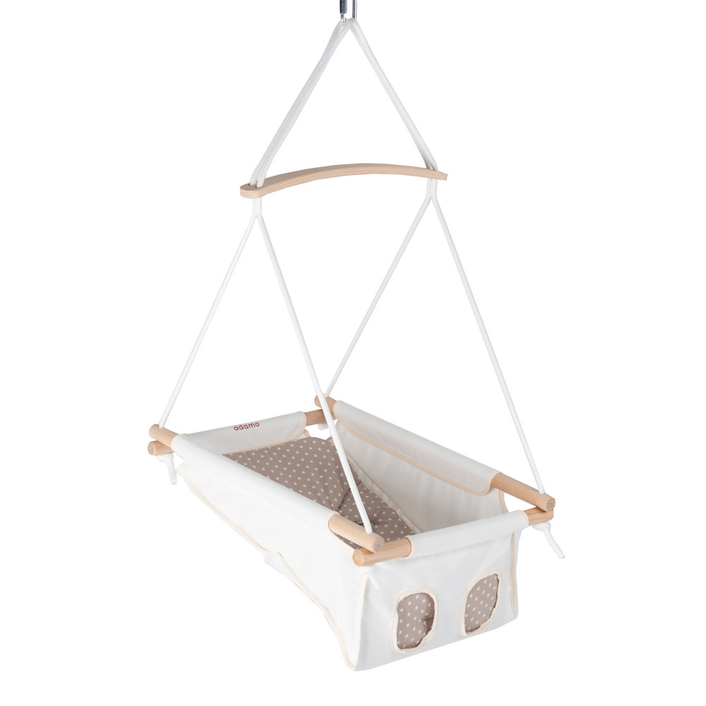 A hinta tartozékai:5 pontos biztonsági övvel (a vállpánt rész központi csatról való lehúzásával 3 pontossá alakítható a már ülő gyermekek számára) ellátva speciális kialakítású és anyagú külső hinta huzat, amely a Titok kulcsabababarát, kezeletlen keményfa rudazat,a baba kezecskéknek megfelelő vastagságú kötélzet, amelyet keresztrúddal, és egy speciális, magasság állításra alkalmas alkatrésszel szereltünk össze.100% pamut, ÖKO-TEX minőségű párna, amelynél minden esetben figyelembe vettük, hogy a megfelelő mikroklímát biztosítsa kis használójának.FONTOS! A rugót nem tartalmazza a doboz, válaszd ki a gyermeked súlyának megfelelőt és azt is helyezd a kosaradba!Az Adamo hinta, a rég elfeledett bölcső és az egy ponton függesztett hinta ötvözete. Újszülött kortól, egészen a baba 3 éves koráig tudjátok használni! Egy ponton, egy rugóval ellátott kötélzeten függeszkedik, így minden irányú mozgást tud produkálni. Használható bölcsőhintaként, ülőhintaként, rugós hintaként. Egyszerűen megunhatatlan!Fekvő felülete puha, nem merevített. Speciális kialakításának és anyagösszetételének köszönhetően, biztonságosan leutánozza azokat a mozgásokat – és így ingereket is – amelyek az anyaméhben is érik a babát. Ez minden csecsemő esetében pozitív hatással bír az idegrendszer érésére, fejlődésére. Emellett az egészséges csecsemő számára egy megnyugtató, biztonságot adó emléket is idéz.Sérült és koraszülött babák esetében, azért felbecsülhetetlen jelentőségű, mert kiegészíti, és sokkal hatékonyabbá teszi a fejlesztést – a változatos egyensúlyi ingerek, amelyeket ez a hinta remekül biztosít, minden valamirevaló fejlesztés, terápia alapját jelentik. Az édesanyák körében a hinta sikere abban rejlik, hogy ez a fajta inger, nem csak fejleszti a gyermekeket, hanem a nehezebb napokon, mint a pocakfájás, fogzás, frontok… nagyon könnyen megnyugtatja, és el is altatja a babákat. Az Adamo hintát, a gyermekekre tett pozitív hatásai miatt, ma már több mozgásfejlesztő, konduktor és fejlesztőközpont is használja az állapotfelméréseik során, és jó szívvel ajánlja az édesanyáknak otthoni használatra is. Miközben gyermeked önfeledten játszik a hintában, észrevétlenül fejleszti, a szem-kéz-láb koordinációját és az egyensúly érzékét is. Ezek a fajta ingerek és fejlesztések hatással lesznek a későbbi beszéd fejlődésre, írás- olvasás tanulásra egyaránt.Hintáink a kor elvárásainak, és az előírásoknak megfelelően folyamatos fejlesztéseken esnek át. Próbáljuk megtartani az egyensúlyt a régi el nem feledett tudás, a sok éves tapasztalat, valamint az új kutatások és a technikai fejlődés között. Termékeink magas minőségét a visszajelzéseitek is igazolják, hiszen akár 3-4 babagenerációt is kiszolgálnak. Az Adamo jó hírét értékállóságának is köszönheti.