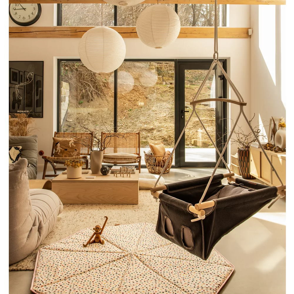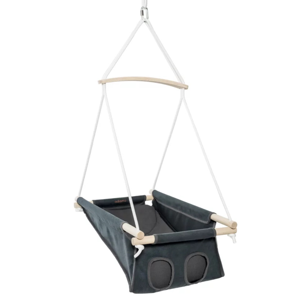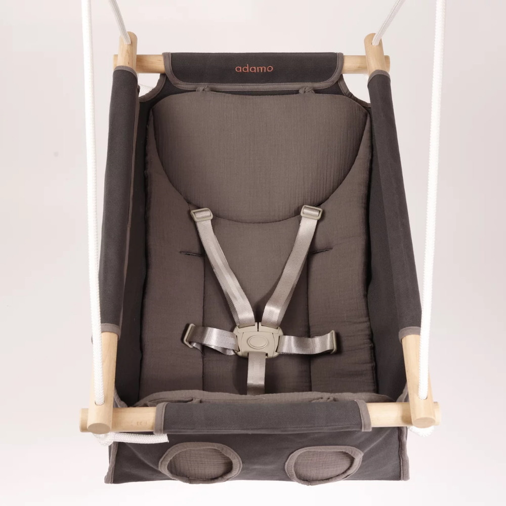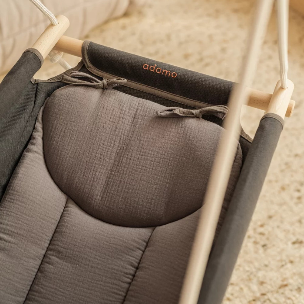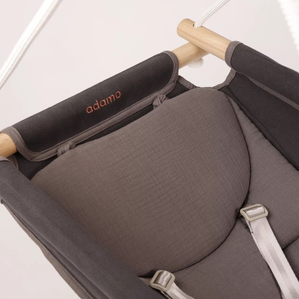 A hinta tartozékai:5 pontos biztonsági övvel (a vállpánt rész központi csatról való lehúzásával 3 pontossá alakítható a már ülő gyermekek számára) ellátva speciális kialakítású és anyagú külső hinta huzat, amely a Titok kulcsabababarát, kezeletlen keményfa rudazat,a baba kezecskéknek megfelelő vastagságú kötélzet, amelyet keresztrúddal, és egy speciális, magasság állításra alkalmas alkatrésszel szereltünk össze.100% pamut, ÖKO-TEX minőségű párna, amelynél minden esetben figyelembe vettük, hogy a megfelelő mikroklímát biztosítsa kis használójának.FONTOS! A rugót nem tartalmazza a doboz, válaszd ki a gyermeked súlyának megfelelőt és azt is helyezd a kosaradba!Az Adamo hinta, a rég elfeledett bölcső és az egy ponton függesztett hinta ötvözete. Újszülött kortól, egészen a baba 3 éves koráig tudjátok használni! Egy ponton, egy rugóval ellátott kötélzeten függeszkedik, így minden irányú mozgást tud produkálni. Használható bölcsőhintaként, ülőhintaként, rugós hintaként. Egyszerűen megunhatatlan!Fekvő felülete puha, nem merevített. Speciális kialakításának és anyagösszetételének köszönhetően, biztonságosan leutánozza azokat a mozgásokat – és így ingereket is – amelyek az anyaméhben is érik a babát. Ez minden csecsemő esetében pozitív hatással bír az idegrendszer érésére, fejlődésére. Emellett az egészséges csecsemő számára egy megnyugtató, biztonságot adó emléket is idéz.Sérült és koraszülött babák esetében, azért felbecsülhetetlen jelentőségű, mert kiegészíti, és sokkal hatékonyabbá teszi a fejlesztést – a változatos egyensúlyi ingerek, amelyeket ez a hinta remekül biztosít, minden valamirevaló fejlesztés, terápia alapját jelentik. Az édesanyák körében a hinta sikere abban rejlik, hogy ez a fajta inger, nem csak fejleszti a gyermekeket, hanem a nehezebb napokon, mint a pocakfájás, fogzás, frontok… nagyon könnyen megnyugtatja, és el is altatja a babákat. Az Adamo hintát, a gyermekekre tett pozitív hatásai miatt, ma már több mozgásfejlesztő, konduktor és fejlesztőközpont is használja az állapotfelméréseik során, és jó szívvel ajánlja az édesanyáknak otthoni használatra is. Miközben gyermeked önfeledten játszik a hintában, észrevétlenül fejleszti, a szem-kéz-láb koordinációját és az egyensúly érzékét is. Ezek a fajta ingerek és fejlesztések hatással lesznek a későbbi beszéd fejlődésre, írás- olvasás tanulásra egyaránt.Hintáink a kor elvárásainak, és az előírásoknak megfelelően folyamatos fejlesztéseken esnek át. Próbáljuk megtartani az egyensúlyt a régi el nem feledett tudás, a sok éves tapasztalat, valamint az új kutatások és a technikai fejlődés között. Termékeink magas minőségét a visszajelzéseitek is igazolják, hiszen akár 3-4 babagenerációt is kiszolgálnak. Az Adamo jó hírét értékállóságának is köszönheti.