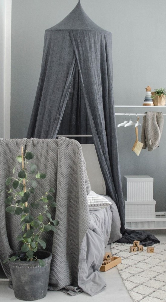 A baldachin emellett stílusos és elegáns kiegészítője a gyerekszobának. A sötét szürke szín modern és időtálló, így bármilyen stílusú szobába tökéletesen illeszkedik. A baldachin könnyedén kombinálható más színekkel és dekorációs elemekkel, így a szoba egyedi és személyre szabott lehet.