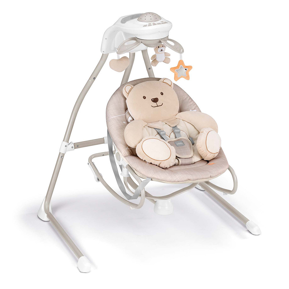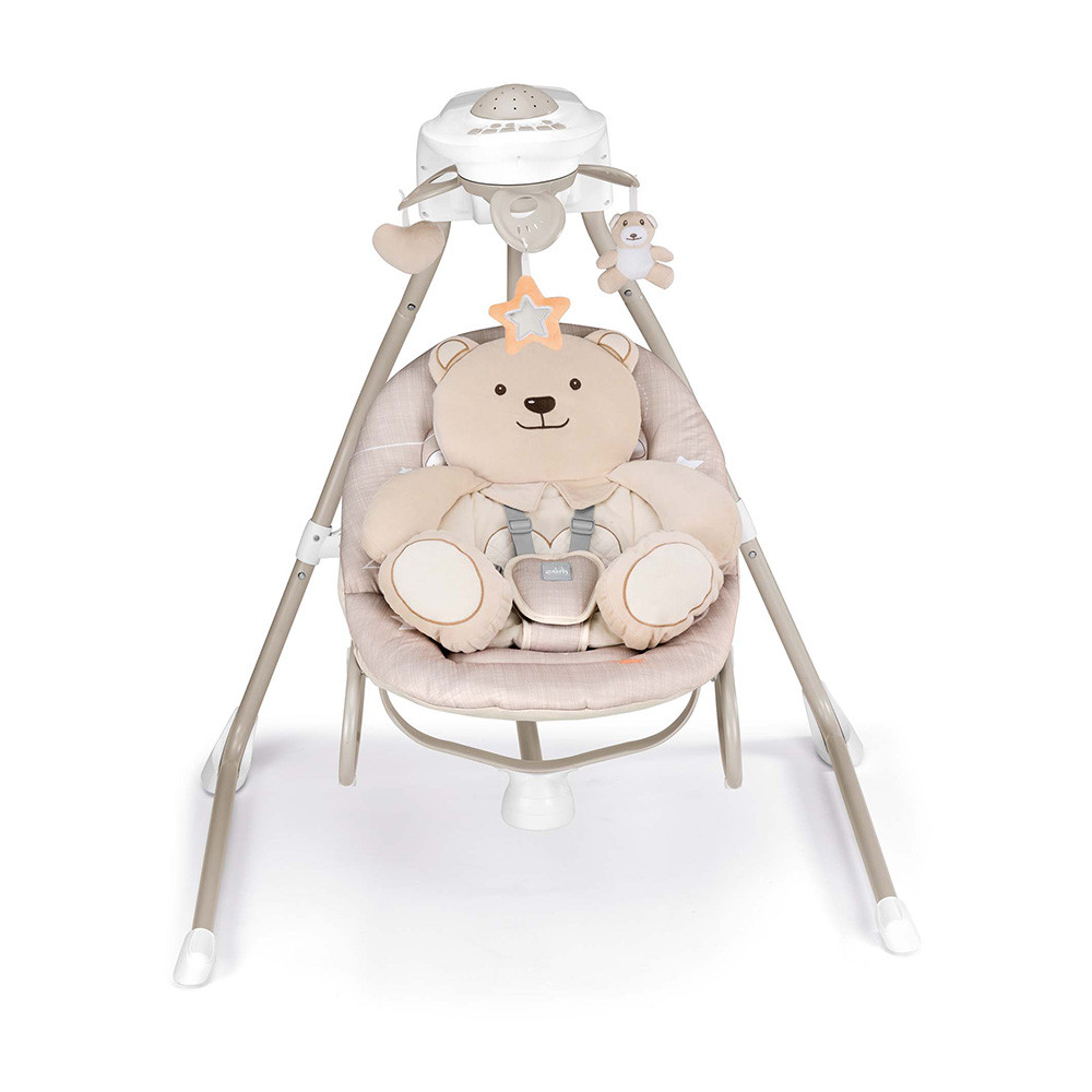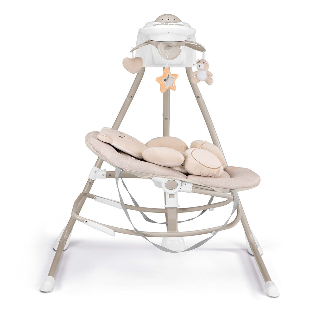 Az elektromos hinta kagylója körülöleli, ringatja, és megnyugtatja a babát. 4 sebességes hinta felfelé vetítõ projektorral. 5 dallam és 3 természetes hangot játszik, de akár MP3 lejátszót is rá lehet kötni. A hangereje állítható. Automatikus kikapcsolás-idõzítõvel rendelkezik (10-20-30 perc).