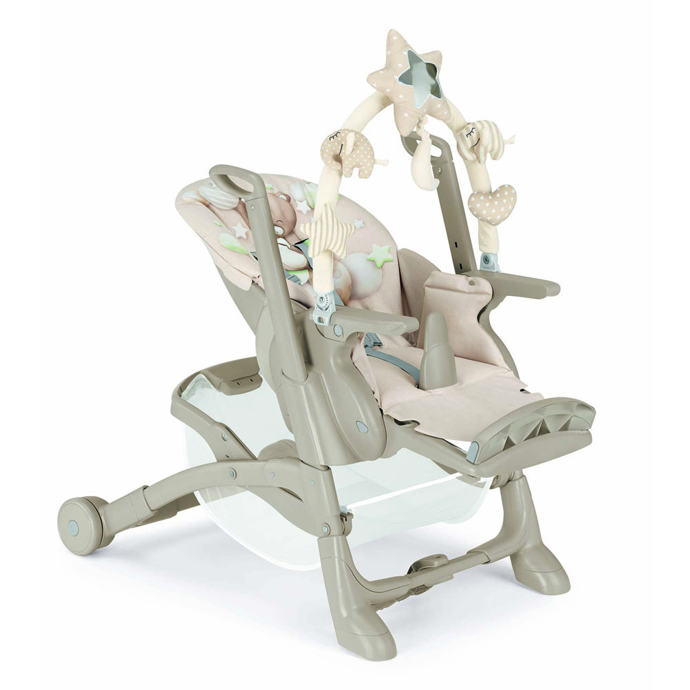 - 2 helyre (a karfákra vagy az oldalsó karokra) felszerelhetõ játékhíd, levehetõ zörgõ/csörgõ/sípoló/tükrös játékokkal