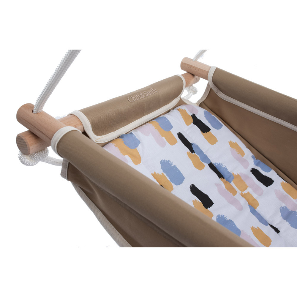 Chill&Smile klasszikus babahinta – Természetes Kényelem és Biztonság A hintázás nemcsak játék, hanem a fejlődés része is. A mozgás koordinációja, az egyensúlyérzék ésa térbeli tájékozódás mind javulnak, miközben a gyerekek örömmel hintáznak. A szülők számára pedig a hintázás lehetőséget ad arra, hogy egy pillanatra megálljanak, és élvezzék a gyermekükboldogságát. Minden egyes hinta gondosan lett megtervezve, hogy a baba és a szülők számára is örömteli és pihentető élményt nyújtson. Az otthon melege, a természetesség és a szeretet mindmegjelennek ezekben a hintákban, amelyek acsaládi pillanatok különleges részévé válnak.A hinták nevei szorosan kapcsolódnak a szülői szeretethez és gyengédséghez. Minden egyes név egy becézés, amit sok szülő használ gyermeke számára. Ezek az elnevezések - mint Virágszál, Kincsem, Bogyó, Csillagom és Manó - azt a szeretetet és törődést tükrözik, amit a szülők éreznek gyermekeik iránt. A hinták is ezt az érzést hivatottak megtestesíteni: kényelmet, biztonságotés a szeretet ölelését nyújtják a legkisebbek számára.A klasszikus babahinta a tökéletes választás azoknak a szülőknek, akik természetes anyagokból készült, biztonságos és kényelmes hintát keresnek gyermekük számára. Ideális újszülött kortól akár 3 éves korig, segít megnyugtatni és szórakoztatni a babát. Főbb jellemzők: 1.Kényelmes és ergonomikus kialakítás A babahinta puha, légáteresztő pamutból készült, amely biztosítja a baba kényelmét és támogatja az egészséges testtartást. A hintázó mozgás nyugtató hatású, segíti az altatást és hozzájárul a baba egyensúlyérzékének fejlődéséhez. 2.Biztonság mindenek felett A biztonsági öv gondoskodik arról, hogy a baba biztonságosan helyezkedjen el a hintában. Az erős, strapabíró fa keret és a megbízható rögzítési rendszer stabil használatot garantál. 3.Könnyû használat és hordozhatóság A babahinta egyszerûen felszerelhető beltéren és kültéren egyaránt. Kompakt méretének és könnyû szerkezetének köszönhetően könnyen mozgatható, így bárhová magaddal viheted, hogy gyermeked mindig otthon érezhesse magát. 4.Természetes anyagok A természetes pamut és fenntartható forrásból származó fa alkatrészek biztosítják, hogy a babahinta környezetbarát és bababarát legyen. Mûszaki adatok: - Ajánlott életkor: 0-3 év - Terhelhetőség: max. 15 kg - Anyagok: 100% pamut huzat, természetes fa - Tartozékok: biztonsági öv, állítható magasságú kötélzet, hintapárnaRendeld meg most, és ajándékozd meg gyermekedet a hintázás örömével!Klasszikus Babahinta – egyszerûség, amely sosem megy ki a divatból.