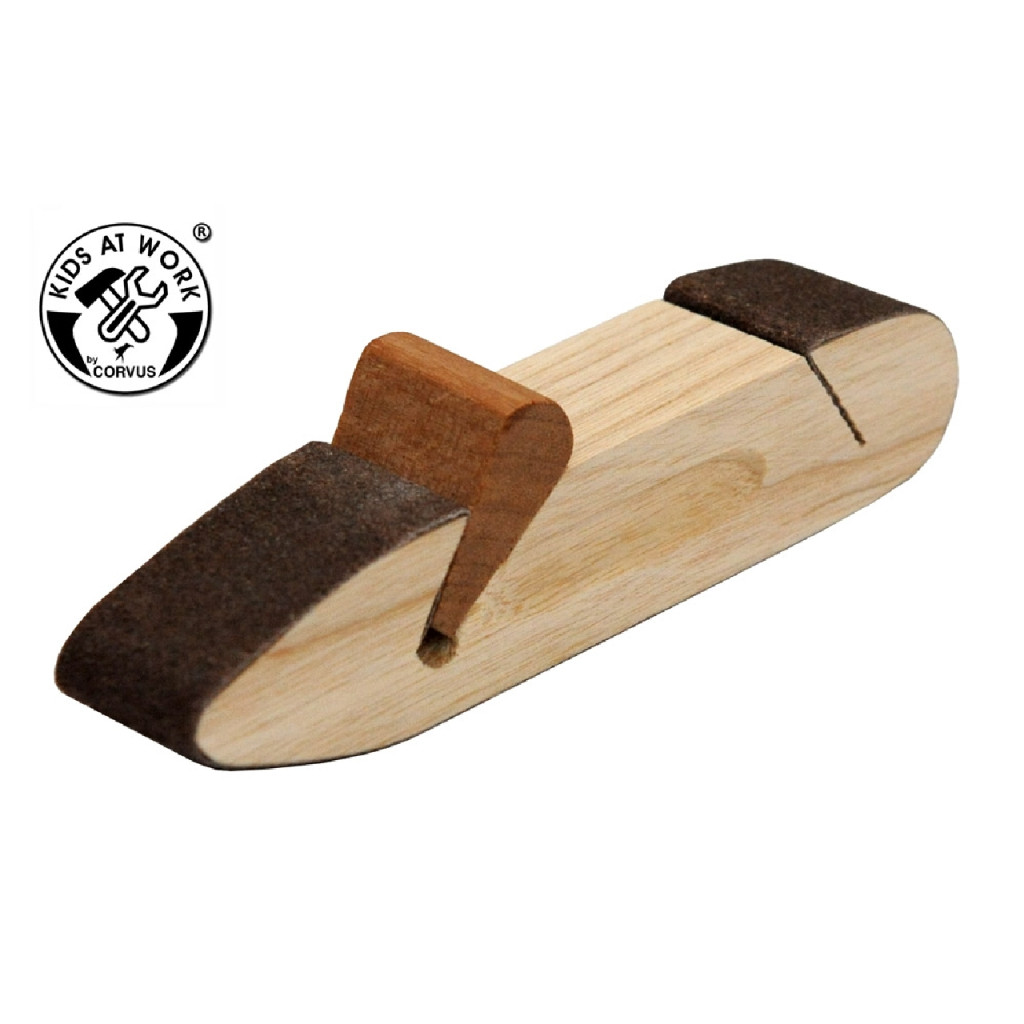 A kis, gyermekkezekhez méretezett szerszám hasznos eszköz a sima felületek elkészítéshez. A méretre vágott csiszolópapírt rá kell feszíteni a fára. A fa különbözően kialakított részei segítenek a problémás helyek finom megmunkálásában.