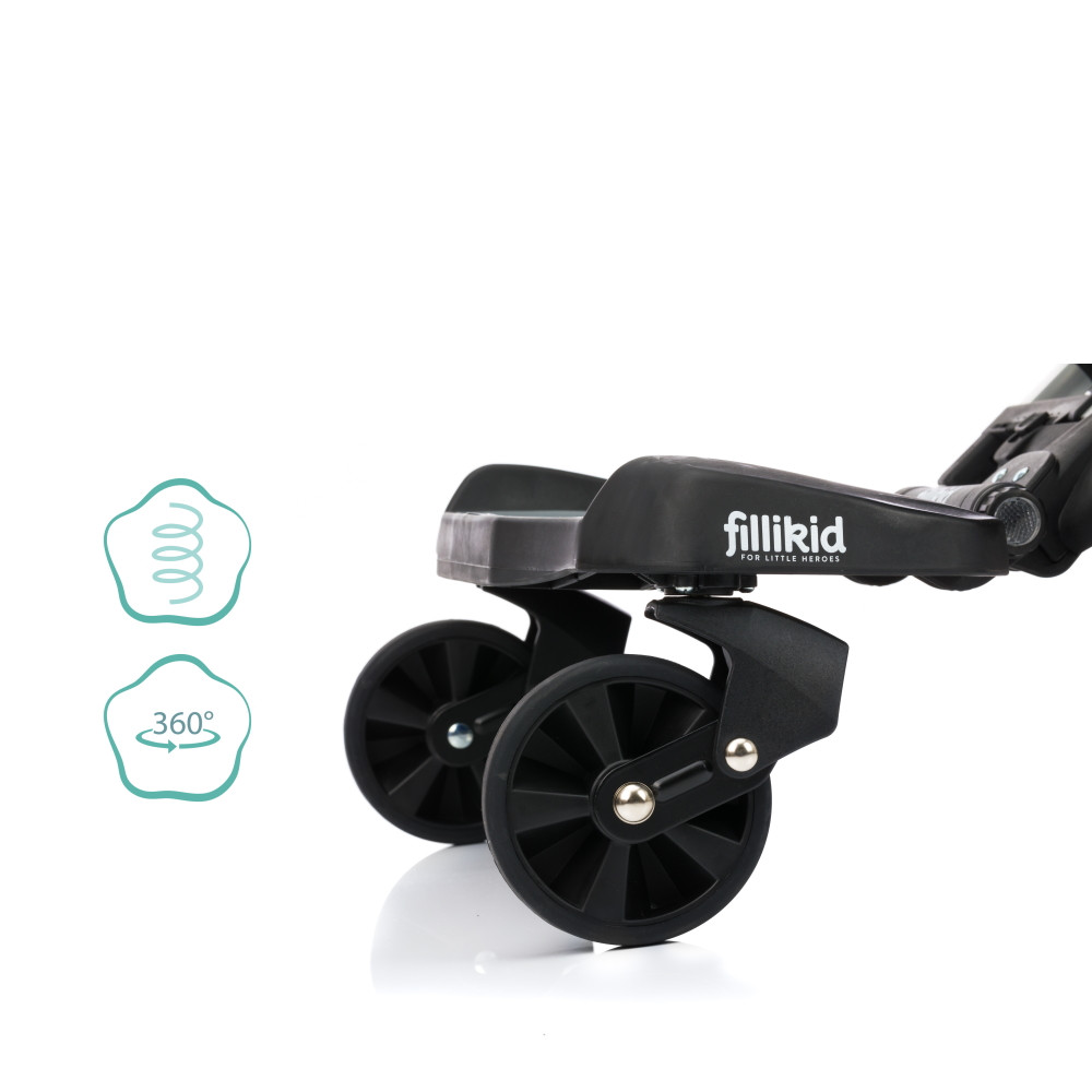 A Fillikid testvérfellépõ a 4 módon állítható csatlakozó rendszernek köszönhetõen univerzális: szélességében kb. 30-47 cm közt és hosszúságban 4 fokozatba állítható csatlakozókarok, 180°-ban elforgatható csuklók, vastagabb babakocsivázhoz is elegendõen hosszú pántok. Szinte minden babakocsihoz és sportbabakocsihoz illeszkedik. Könnyen és szerszám nélkül rögzíthetõ keresztirányú és függõleges vázrendszerre is.