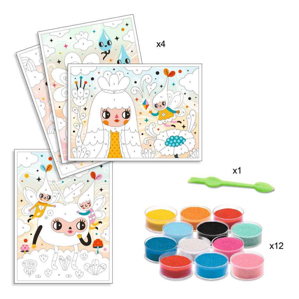 A legkisebbek számára is elérhető tevékenység, nagyok a felületek az előre nyomtatott táblákon.Tiszta tevékenység: a gyermek a dobozban dolgozik, így nem szórja szét a homokot. Egy okos készlet, ahol a dobozban van egy kis lyuk, hogy összegyűjtse a felesleges homokot és a széles szájú edényekbe átöntse. Van hozzá egy - a Djeco által kifejezetten a ragasztott alkatrészek egyszerű eltávolítására kifejlesztett eszköz. A rugalmas záródású  tárolódoboz alkalmas a fel nem használt anyagok tárolására a tevékenység befejezése után. A készlet része egy magyarázó füzet, amely lépésről lépésre részletezi, mit hogyan lehet, kell megvalósítani.