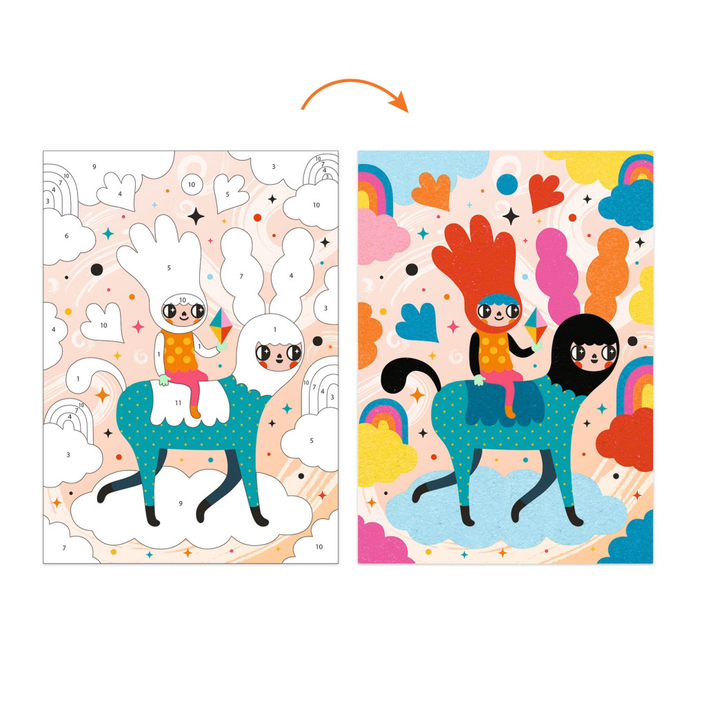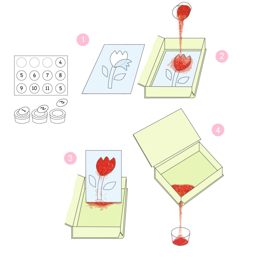 A legfiatalabbaknak tervezett színes homokkép képkészítő. A 4 kép befejezéséhez a gyermek a tábláját a dobozba helyezi, a mellékelt eszközzel feltárja a nagy, előre beillesztett területeket, majd a füzetben megadott színkódokat követve színes homokkal szórja be azokat. Minden újabb homokszórás előtt a gyermek a doboz sarkában lévő kis lyukon keresztül összegyűjti és kiönti az előző színezésből maradt, felesleges színező homokot. Ez így nagyon praktikus, hogy ezzel elkerülhetőek a színek keveredése!