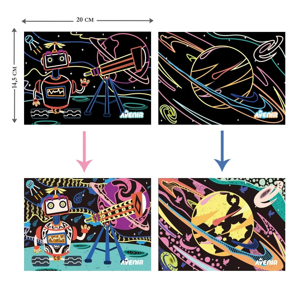 • Fejleszti a kreativitást és a képzelőerőt: A karckép technika lehetővé teszi a gyermekek számára, hogy egyedi és lenyűgöző műalkotásokat hozzanak létre, miközben szárnyra kel a fantáziájuk.
