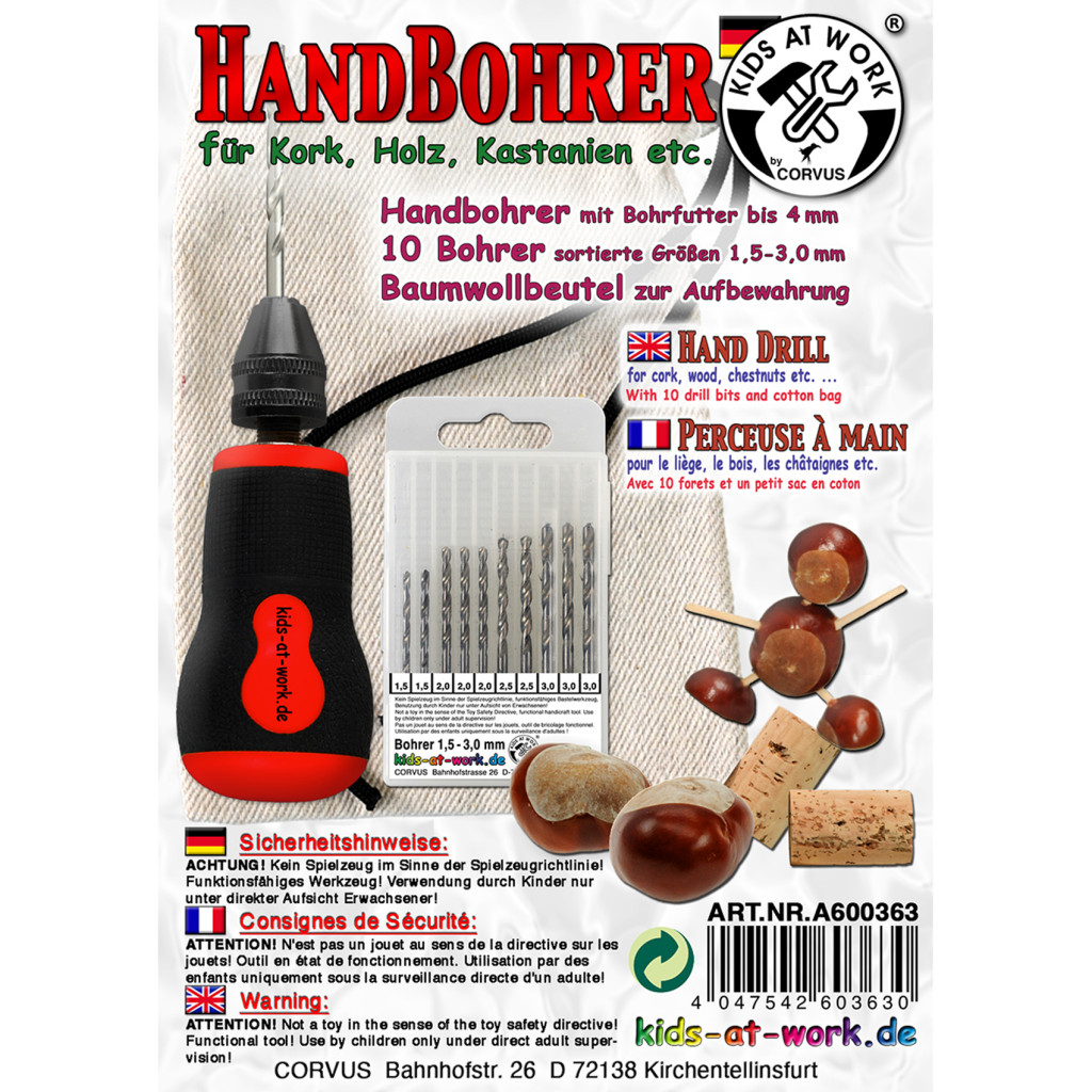 Gesztenye, parafa, fa és egyéb nem túl kemény anyagok megmunkálásához ajánljuk. 10 db fúróhegyet tartalmazó doboz és egy strapabíró zsákszövet tároló. Válogatott fúrószárak: 3 db 3 mm-es, 2 db 2,5 mm-es, 3 db 2 mm-es, és 2 db 1,5 mm-es.