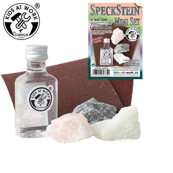 Szappankő mini készlet, amely 3 kicsi, különböző szappankövet tartalmaz, valamint csiszolópapírt, és csiszolószivacsot a nedves csiszoláshoz, és 30 ml szappankőolajat. Alkoss kis ékszerköveket, medálokat és még sok mást.