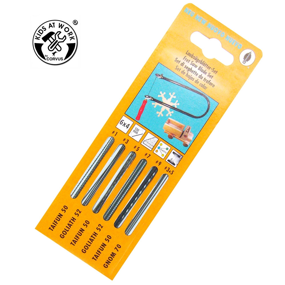 A készlet finomabb és rusztikus vágásra alkalmas pengéket tartalmaz, fához, fémhez és műanyaghoz.