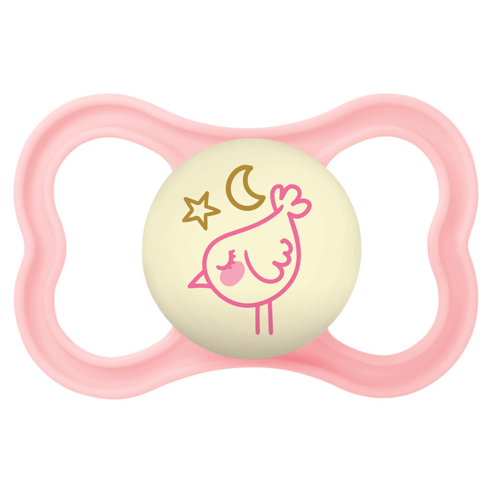 Az extra vékony és rugalmas szívóka lehetõvé teszi a zárt szájtartást, hogy a babák természetes módon tudják becsukni a szájukat cumizás közben. Ez a fogaknak elegendõ helyet hagy a normál növekedéshez. Az extra nagy szellõzõlyukaknak köszönhetõen különösen kíméletes a babák érzékeny bõréhez. A cumi gombja világít a sötétben.