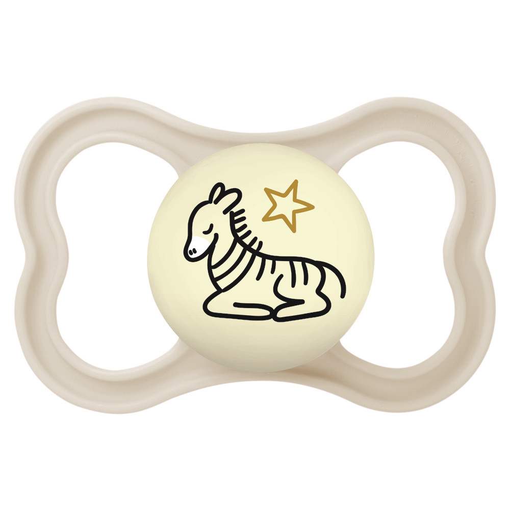 Az extra vékony és rugalmas szívóka lehetõvé teszi a zárt szájtartást, hogy a babák természetes módon tudják becsukni a szájukat cumizás közben. Ez a fogaknak elegendõ helyet hagy a normál növekedéshez. Az extra nagy szellõzõlyukaknak köszönhetõen különösen kíméletes a babák érzékeny bõréhez. A cumi gombja világít a sötétben.