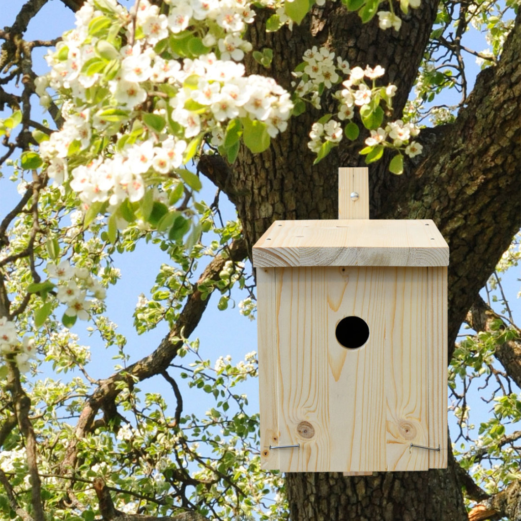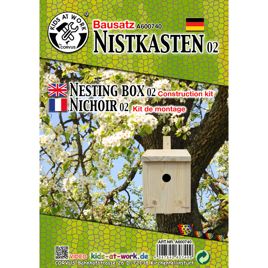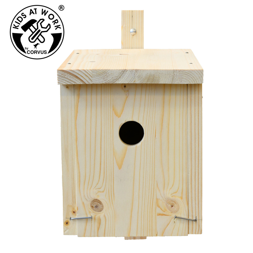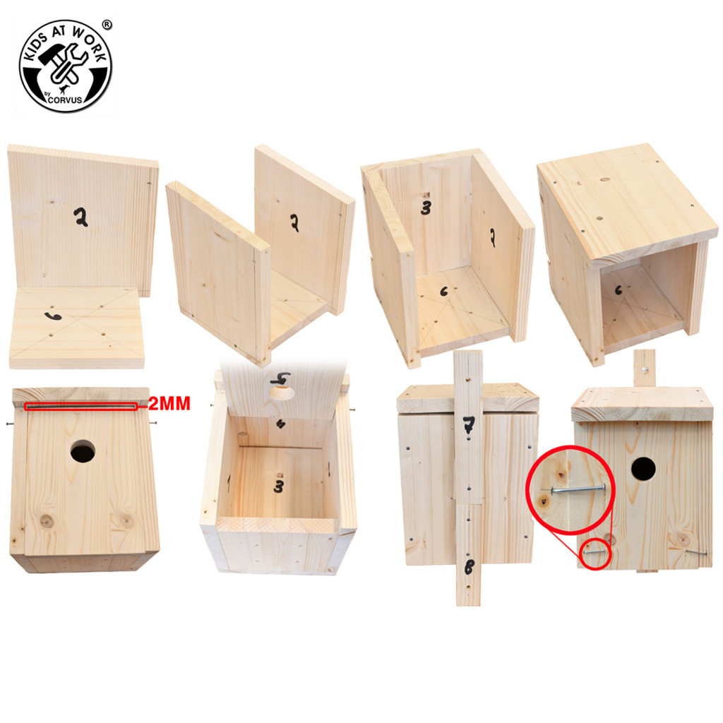 Fészkelő doboz készlet, ragasztott fából, 18 mm vastagsággal. 20 db acélszeggel és 2 db erdészeti szeggel. Az összeszerelés néhány egyszerű kézi tevékenységet igényel (jelölés, fúrás, ragasztás, szögelés). Felnőtt irányításával, részletes szerelési útmutatóval az alapvető munkavégzési ismeretek elsajátítása és a kielégítő sikerélmény megvalósulása. Az építési terv olyan vágáson alapul, amely nem termel fahulladékot. 20 cm-es szabványos tábla kiviteli terve is mellékelve van.
