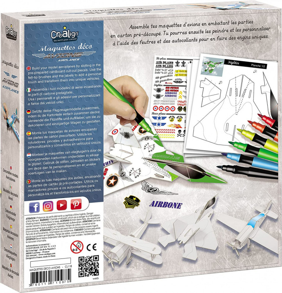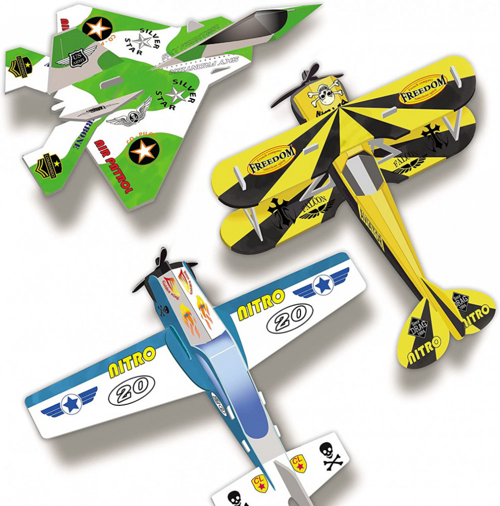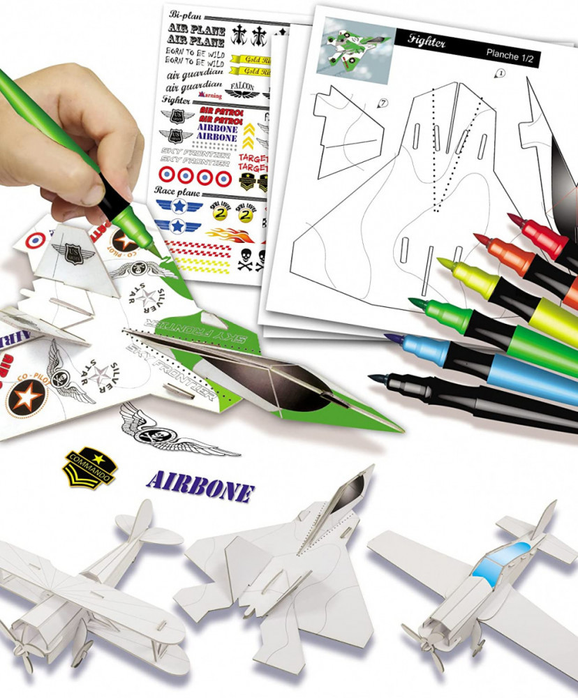 Építsd meg a vázat kemény kartonpapírból, majd színezd ki a különleges filctollakkal és díszítsd a hozzájuk tartozó matricákkal. A színes gyártmányok máris repülhetnek!