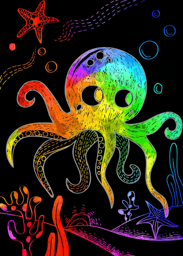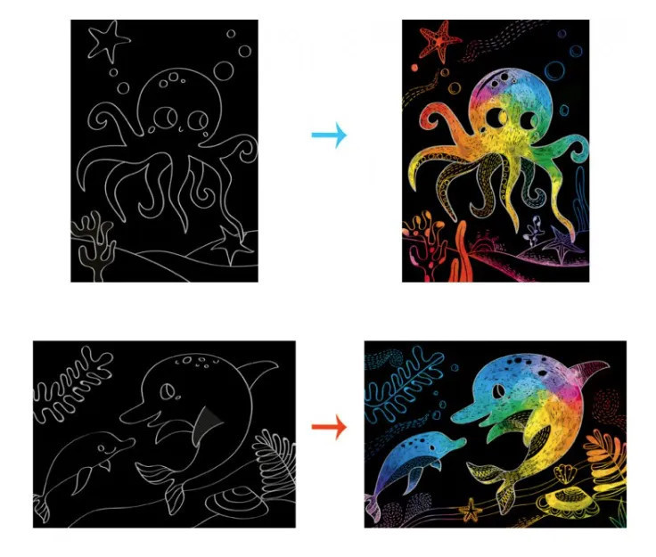 Előny: A karckép technika lehetővé teszi a gyermekek számára, hogy egyedi és kreatív alkotásokat hozzanak létre. A rejtett képek felfedezése izgalmas élményt nyújt, és ösztönzi a képzelőerőt. A karcoló pálca használata fejleszti a kézügyességet és a szem-kéz koordinációt.