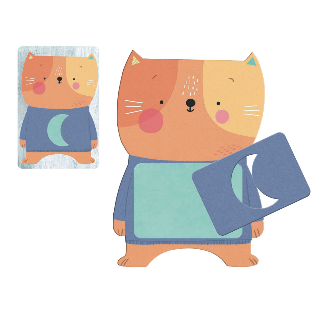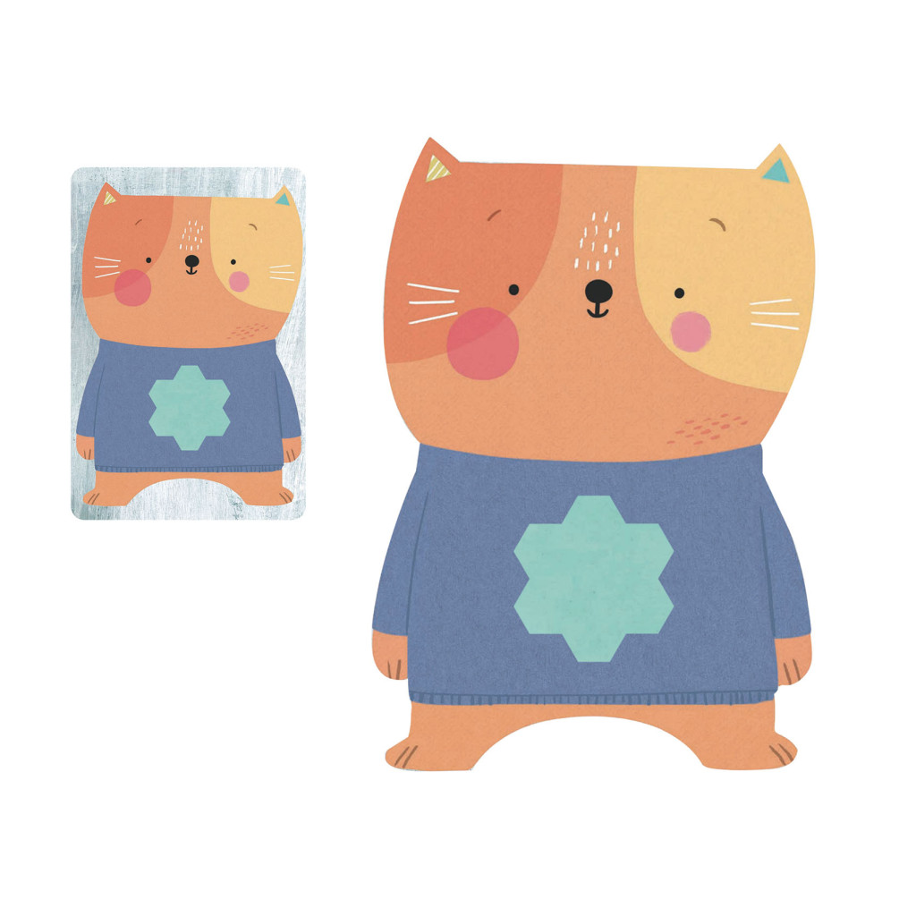 Egy egyszerű és szórakoztató játék az alakzatok, formák felismerésére, egyeztetésére. Nem könnyű megkülönböztetni ezeket a macskákat, amik itt a kártyákon cicáskodnak, csak a pólójuk mintája változik. A kártya megnyeréséhez a gyermeknek a megfelelő formájú "pólóval" kell felöltöztetni a macskát. 2 játékmódra van lehetőség: az első „tanulási” mód, hogy egy felnőtt segítségével a gyermek felfedezi a geometriai formákat. Egy második "gyors játszma" mód 2 játékos számára. A játékhoz műanyag kártyák vannak a tartósság érdekében. Nagyon részletes leírásúak a szabályok, amelyek segítenek a szülőknek, hogy könnyen tudják használni ezt a játékot gyermekük fejlesztésre.