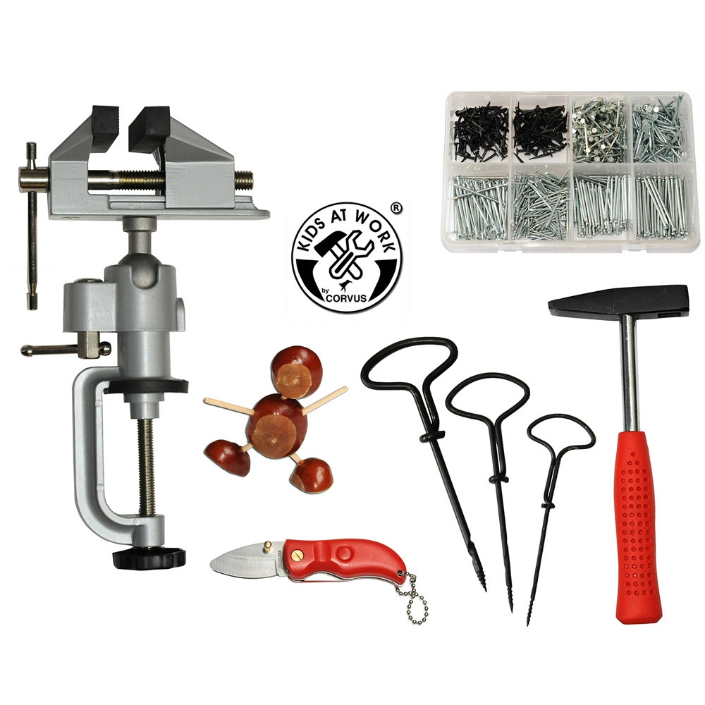 A készlet tartalmaz 1 db 90°-ban dönthető, asztalhoz rögzíthető satut, ledes fénnyel ellátott faragókést, 750 db-os szegkészletet, 300 db fogpiszkálót, 14 db 20 cm hosszú 3 mm-es nyársat, 3 db különböző méretű gesztenyefúrót, 1 db 10 x 10 cm-es bőrt, 1 db fémszárú kiskalapácsot. Mindezek egy karton dobozban.