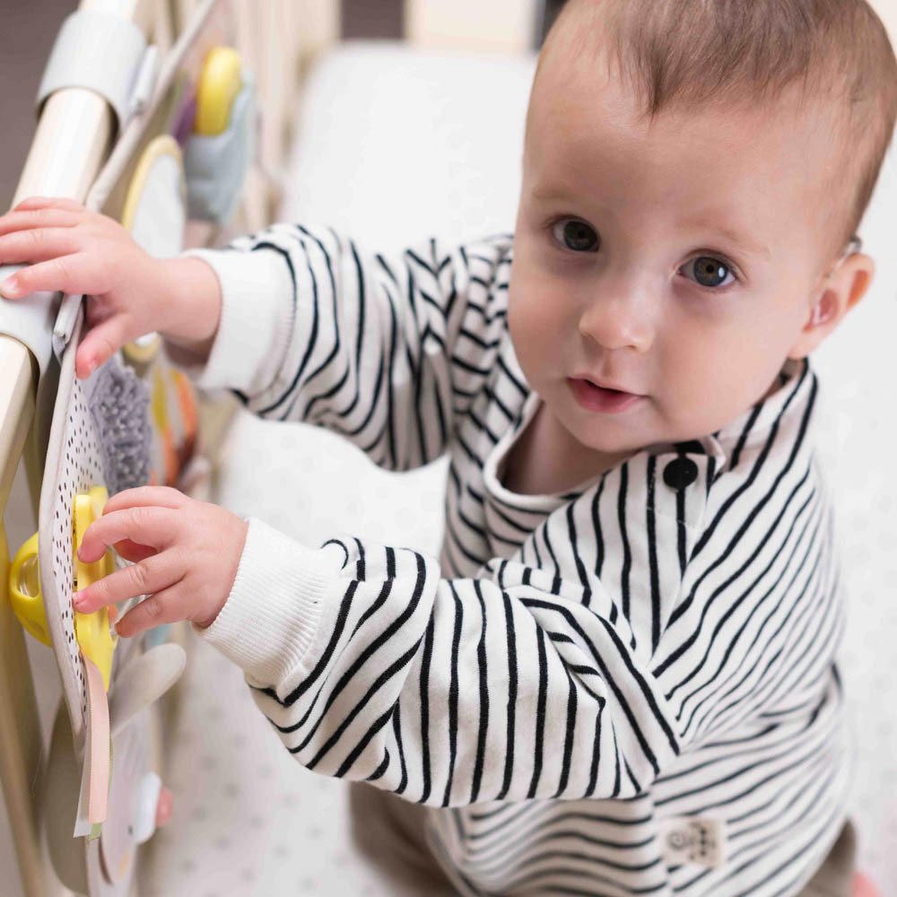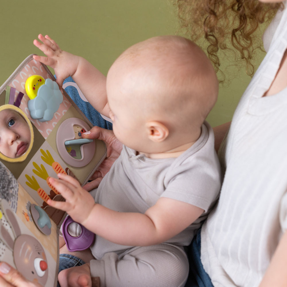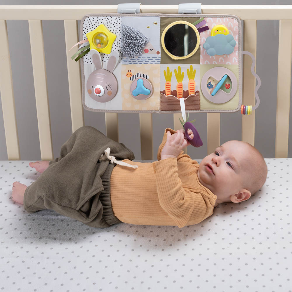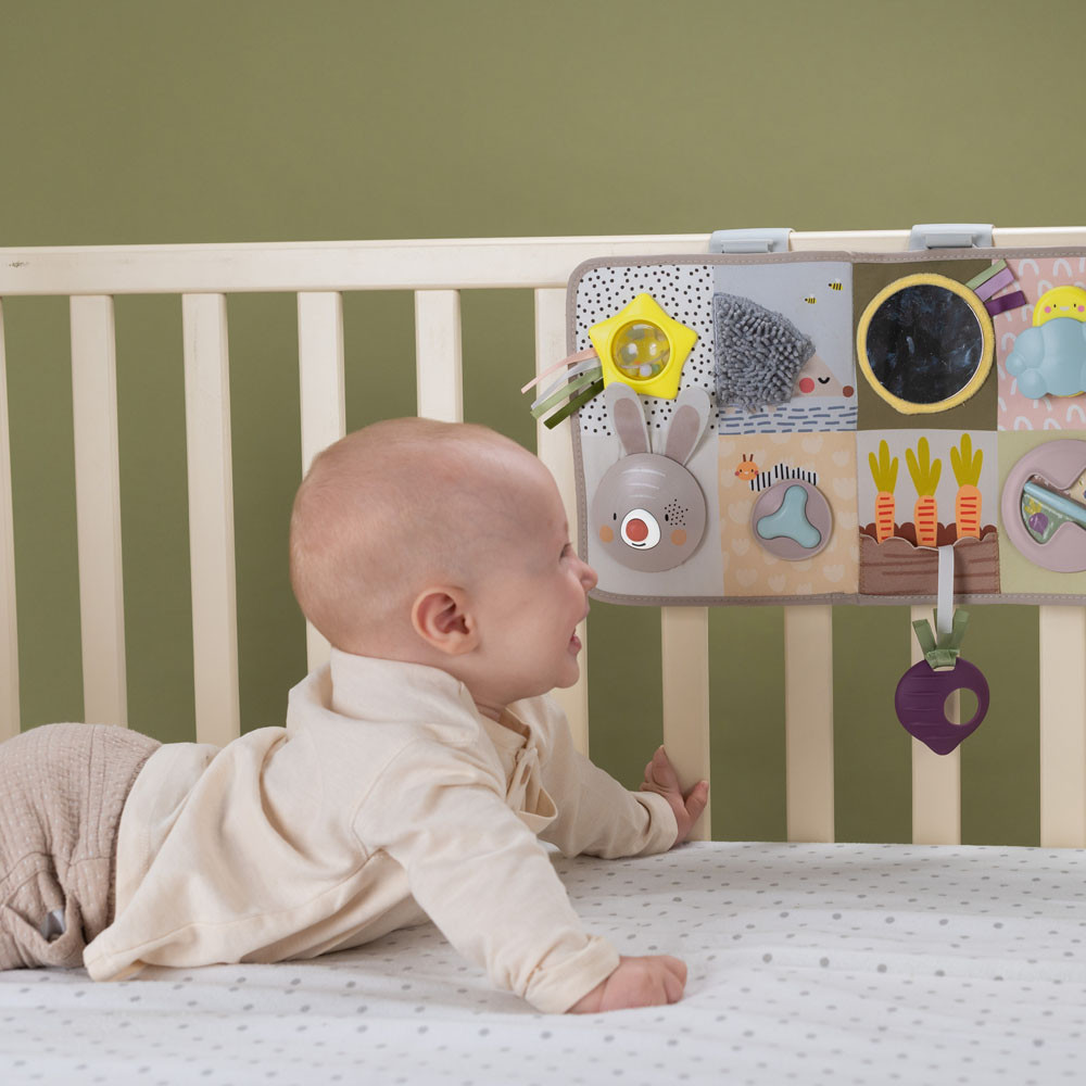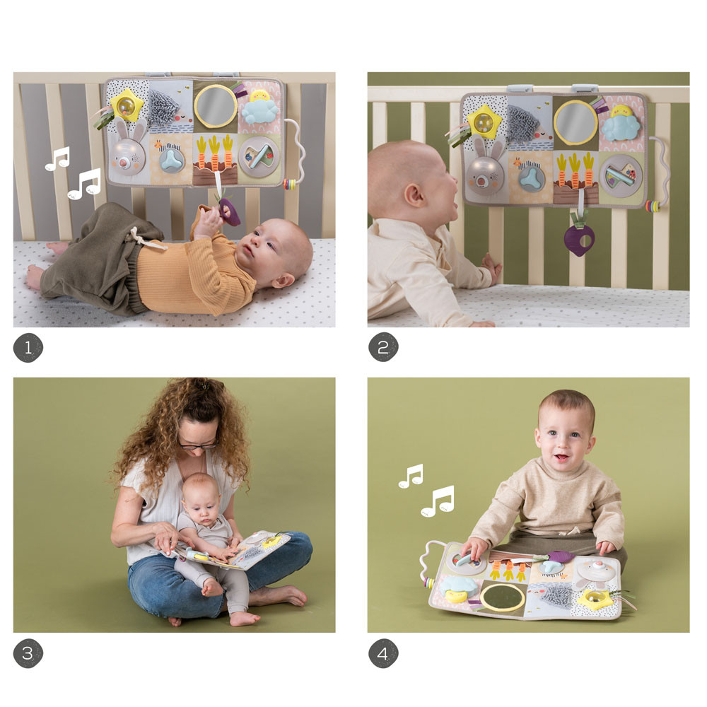 Fejlesztő tevékenységközpont zenével és fénnyel, amely együtt nő a babával. A különböző funkciókkal való játék serkenti a baba érzékszervei fejlődését, a finom- és nagy-motorikát, valamint a szem-kéz koordinációt.Fejlesztő tevékenység központ zenével és fénnyel, 3 fejlődési szakaszban használható:- 1. szakasz (0 hó): Háton fektetés – A kiságy oldalán lógva a baba a hátán vagy a hasán fekve felfedezheti és megtapasztalhatja a különféle funkciókat és játéklehetőségeket.- 2. szakasz (3 hó): Has – idő – Számos játék és felfedezhető funkció a hosszan tartó játék érdekében, miközben a baba a pocakján van. A könyv önmagában is megállhat, hogy ösztönözze a hasi játékot.- 3. szakasz (8 hó): Ülő helyzet – Aktív játékként élvezhető, amikor a baba mozgékonyabbá válik, és elkezd felülni és játszani. Ösztönzi a szülő-gyermek interakciót és a közös tevékenységet.13 fejlesztő tevékenységet tartalmaz a kölcsönös játékhoz és felfedezéshez: zene és fény nyuszi, "kukucs" tevékenységek, zörgő labda, racsni, színes szalagok, bababiztos tükör, labirintus színes gyűrűkkel és még sok más.Nyomja meg a Nyuszi orrát a zene aktiválásához és a homlok megvilágításához, tanítva az okot és okozatot. Minden megnyomás egy másik dallamot aktivál, a 3 féle közül.A fejlesztő tevékenységközpont két klipsszel rögzíthető. Könnyű és könnyen összecsukható, könnyen megfogható fogantyúval, hogy a babák bárhová magukkal vihetik.A különböző funkciókkal való játék serkenti a baba érzékszervei fejlődését, a finom- és nagy-motorikát, valamint a szem-kéz koordinációt.Elemek: 3 x AAA (nem tartozék)Újszülött kortól ajánlotthttps://youtu.be/rLcjoMASIdo