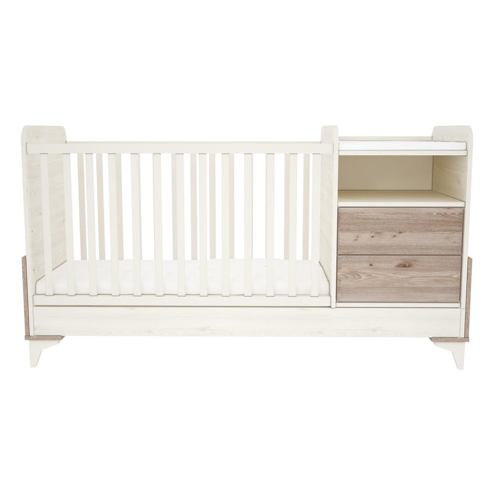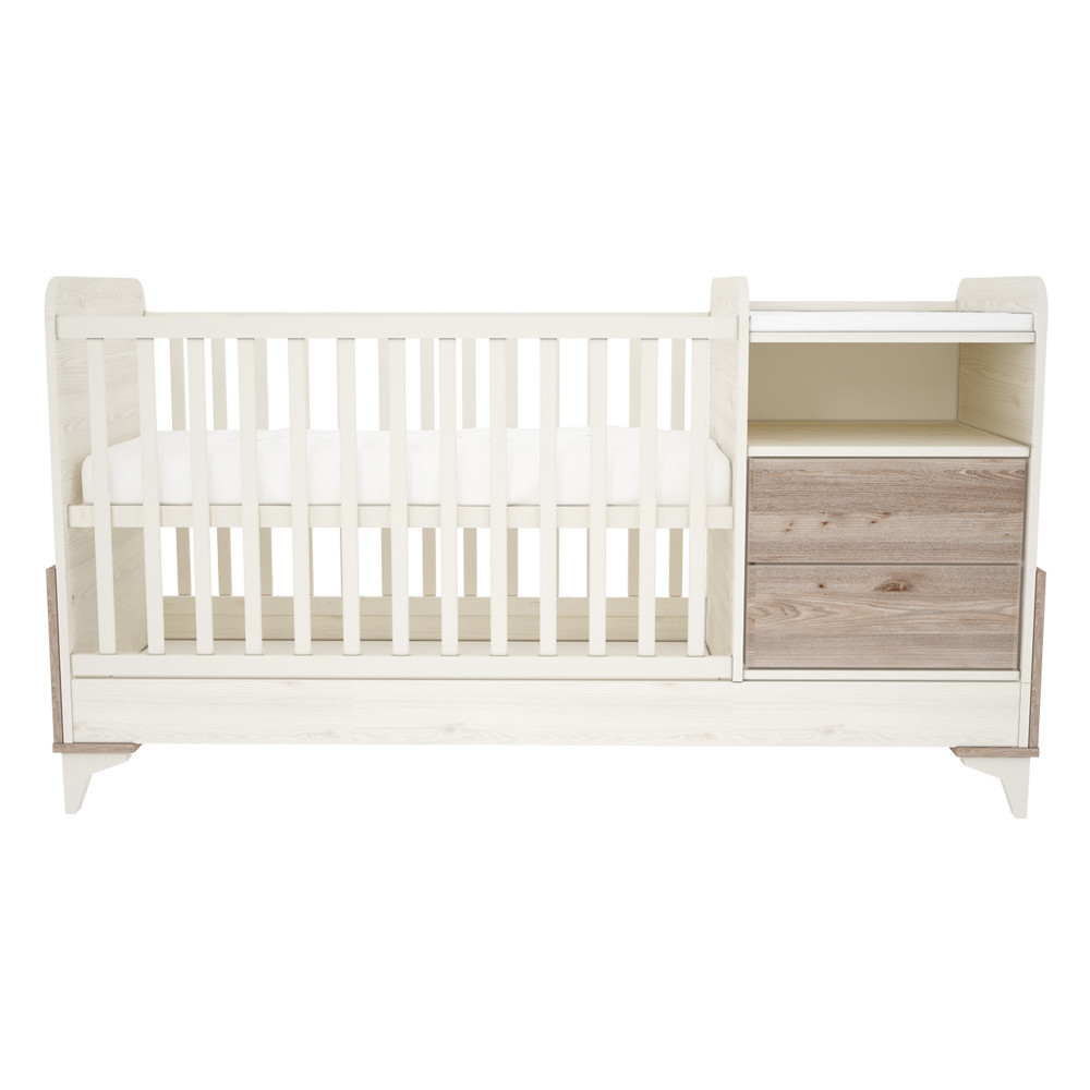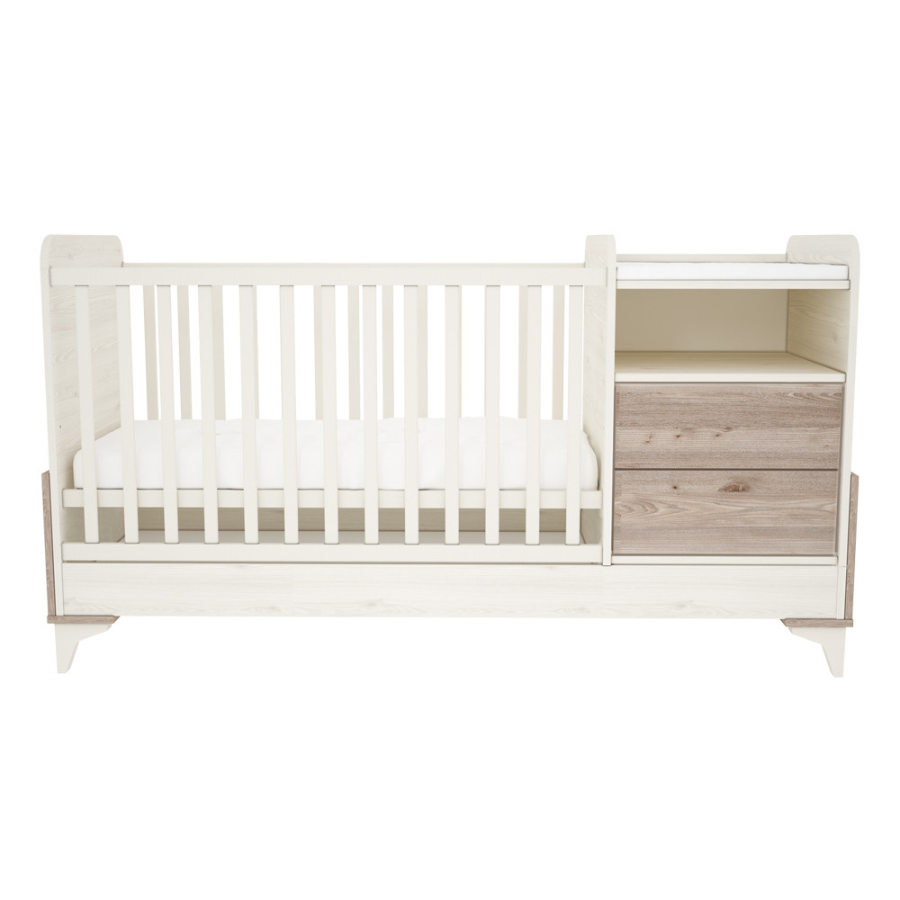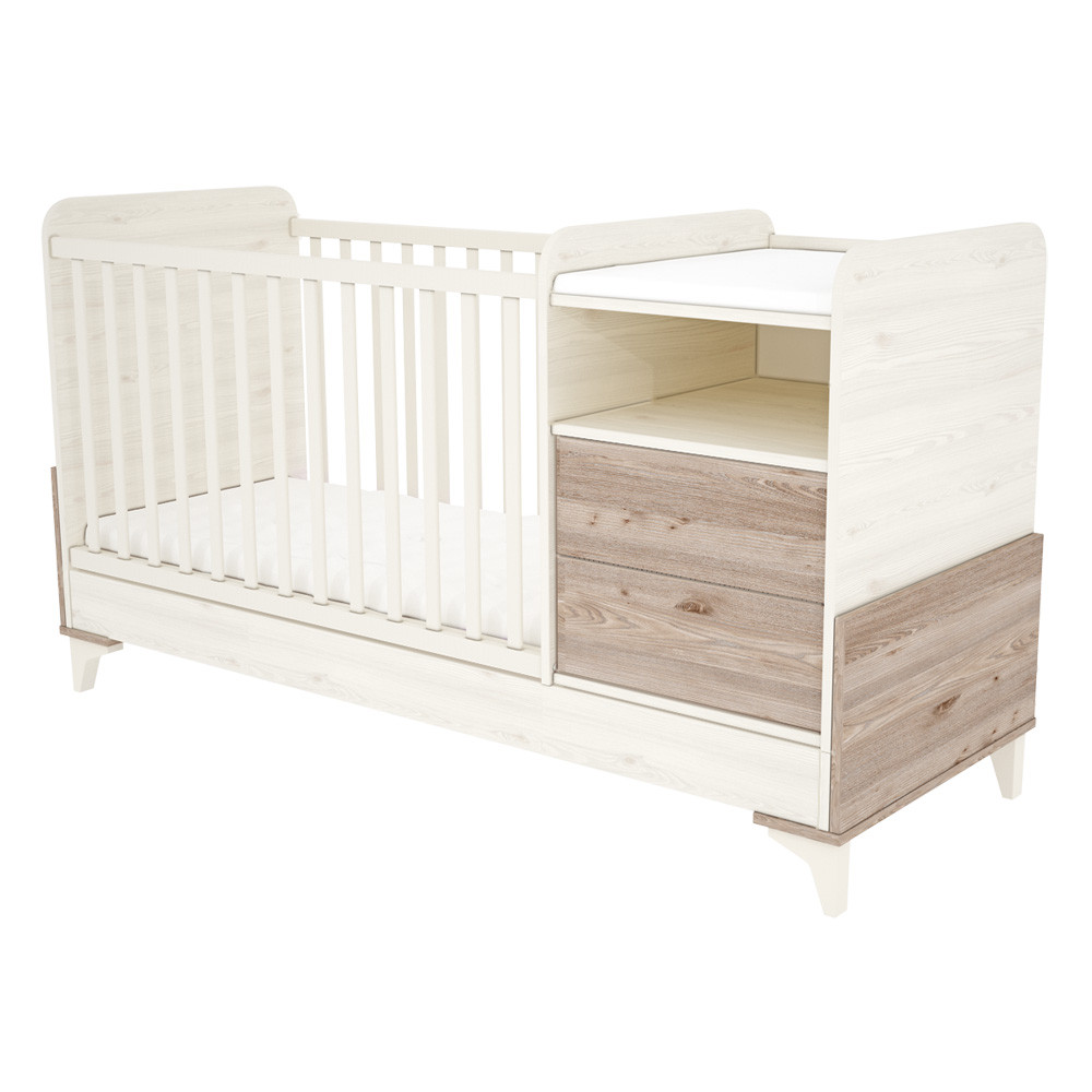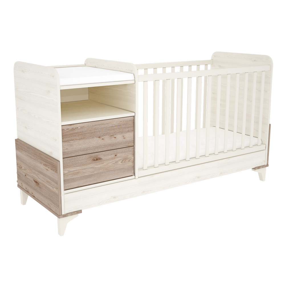 Kombinált kiságyunk megfelelõ választás kisebb babaszobák berendezése során, hiszen kombinálja a klasszikus rácsos kiságyat a pelenkázószekrénnyel, ám jóval kisebb helyet foglal el, mint a két bútordarab külön-külön. A kiságyon a pelenkázószekrény a szobához alkalmazkodva jobb és bal oldalra egyaránt felszerelhetõ. A terméken található fiókok nem rendelkeznek fogantyúkkal mivel nyomásra nyílnak és záródnak.