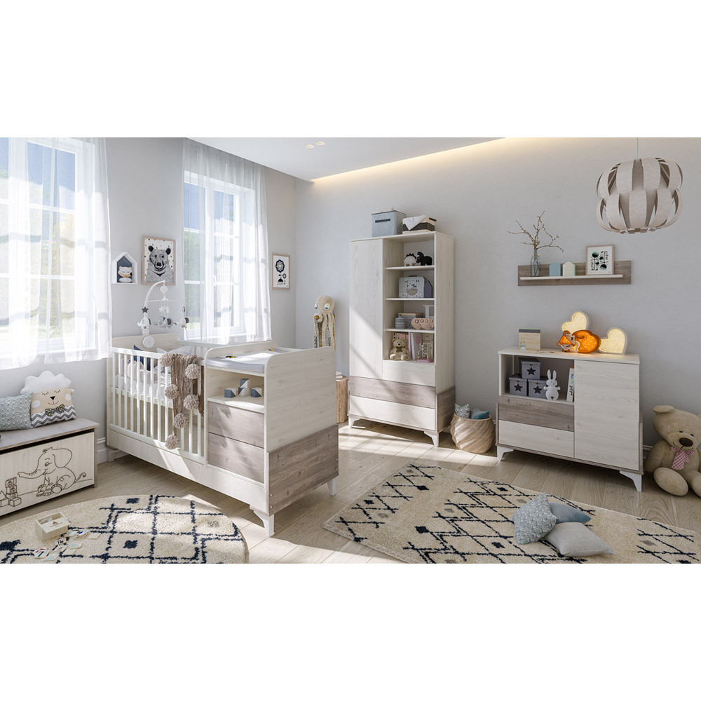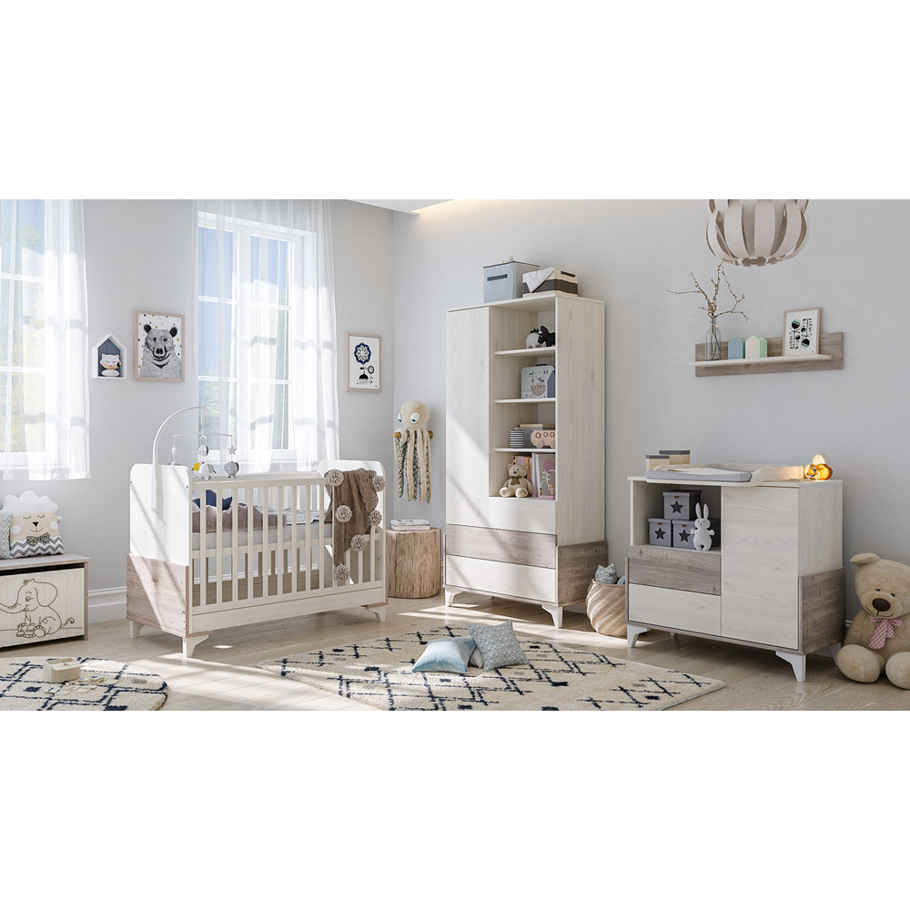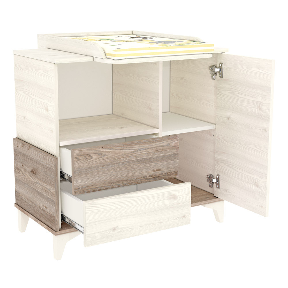 A 95-ös pelenkázó-szekrényünk rendkívül sokoldalúan és praktikusan használható a gyerekszobában, hiszen kevés helyet foglal el, ugyanakkor kialakítása miatt a legsokoldalúbb pelenkázószekrényekínálatunknak. A szekrény rendelkezik egy könnyen pakolható nyitott résszel, egy ajtóval elfedett polcos résszel és két fiókkal. Ez a sokszínû kialakítása teszi a szekrényt jól kihasználhatóvá, remekülrendszerezhetõvé.Eltolható és levehetõ pelenkázófeltétA szekrény eltolható feltéttel rendelkezik mely lehetõvé teszi a kényelmesebb pelenkázást. Mindemellett a pelenkázós idõszak végén sem kell megválnia a bútortó l, hiszen az a pelenkázófeltétlevételével normál komódként tud tovább funkcionálni a gyerekszobában, vagy a lakás bármely más pontján.A pelenkázószekrény része a pelenkázófeltét is, így azt már nem kell külön megvásárolnia!Nyomásra nyíló és záródó ajtók, és fiókokSem az ajtó sem a fiókok nem rendelkeznek fogantyúkkal mivel nyomásra nyílnak és záródnak. Az ajtó zárását emellett egy gáz-csillapítású lassan záró pánt teszi becsapódás-mentessé.AnyagaSzíntartó felületû laminált bútorlap. Laminált bútorlapjaink magas minõségû, kemény színtartó laminálással vannak ellátva. Tisztításuk ennek köszönhetõen gyors, egyszerû és biztonságos.Élek és sarkokTermékeink élei lekerekítettek. A bútorlapok élei 2 mm vastag ABS-sel kerülnek élzárásra, melyek ahagyományos élfóliákhoz képest sokkal magasabb minõséget nyújtanak. A termék minden élét és sarkát mellyel a használat során Ön vagy akár gyermeke érintkezhet ezzel az anyaggal zártuk le melynek lekerekítésének köszönhetõen a bútor nem rendelkezik éles sarkokkal és élekkel.Ívelt bükkfalábakkalA kiságy ívelt bükkfa lábakon áll, amik letisztult modern külsõt kölcsönöznek a terméknek és lehetõvé teszik a szekrény alatti rész egyszerû takarítását.MegfelelõségA kiságy teljes körûen megfelel az Európai Unió és a Magyar Szabványügyi Testület által elõírt szigorú szabványoknak.Méretek (magasság x szélesség x mélység)A szekrény mérete feltét nélkül: 87 x 94 x 45cmA szekrény mérete feltéttel: 93 x 94 x 72 cmA szekrényhez illõ pelenkázólap mérete: 70 x 50 cm*A képek csupán illusztrációk*A képen látható pelenkázólap nem része a terméknek*A pelenkázószekrény fiókjainak belseje és ajtaja mögött elhelyezkedõ polc fehér színbõl készültek.*A pelenkázószekrény kizárólag a képen látható módon szerelhetõSúly 57 kgDobozszám: 2 dobozSzállítási idõ: megrendeléstõl számított 5-8 hét!