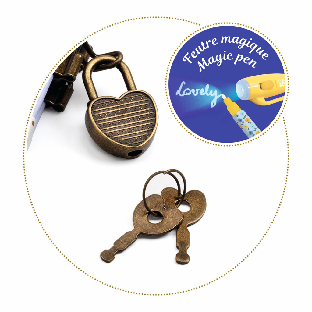 A jegyzetfüzet borítója virágosan gazdagon díszített, elénk hozza a varázslatos mezei hangulatot. A toll valóban varázsolni tud, egyrészt ezzel lehet írni a láthatatlanná váló betűket, másrészt ennek a tollnak a fényénél válnak olvashatóvá a leírt szavak, mondatok, történetek, titkok és élmények. Egy lakathoz két kulcs van, vajon kinek adja oda a naplóíró a titkaihoz a második kulcsot?