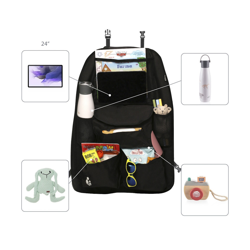 Az ülésre szerelhető intelligens és hatékony szervező nem csupán az Ön útját teszi kellemesebbé, hanem a tablet tartó zsebnek köszönhetően a gyerekekét is, akiket leköt a mesenézés. A rendezőben két palack is elhelyezhető, úgyhogy nem kell attól tartania, hogy kiömlene a tartalmuk. A zsebkendőtartó zseb, valamint az egyéb tárgyak, például játékok tárolására szolgáló további két darab mély zseb kellemes útitárssá varázsolják a rendező, amely segít akkor is rendet tartani a kocsiban, ha a legkisebbekkel utazik. A csatoknak köszönhetően a rendező egyszerűen rögzíthető az ülés hátoldalára, valamint egyszerűen le is vehető róla.