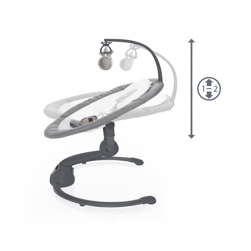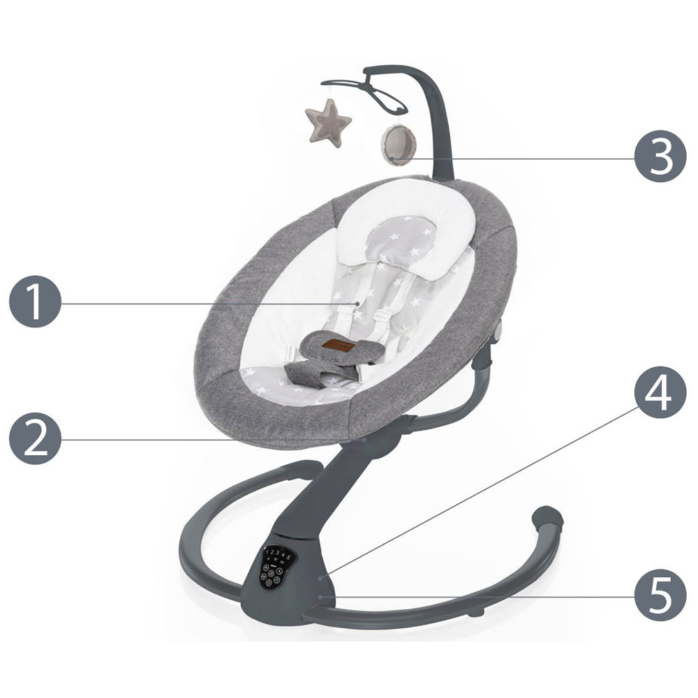 A legjobb minden baba számáraA Zopa nyugágyak kínálatának képzeletbeli csúcspontját képező multifunkcionális Lullaby pihenőszéket azokban a pillanatokban fogja különösen nagyra értékelni, amikor a baba nem alszik – és Ön meg szeretné nyugtatni, el szeretné foglalni, és ezzel egyidejűleg be kívánja vonni a családi történésekbe. A 360°-os elforgatást is kínáló egyedülálló szerkezeti kialakítás lehetővé teszi az ülés egy bizonyos, egyúttal a hintáztatás módját is megválasztó helyzetbe állítását. Ez lehet oldalirányú, ami a hagyományos bölcsőket idézi, vagy előre/hátra irányú, ami helyettesíti a karban ringatást. Elég kiválasztani a gyermek preferenciáinak megfelelő módot. Közismert tény, hogy a kisgyermekek imádják az ütemes mozgást. Hozzájárul harmonikus fejlődésükhöz, és közben megbízhatóan meg is nyugtatja őket. Emlékezteti őket ugyanis arra a tökéletes biztonságra, amelyet még az édesanyjuk pocakjában élvezhettek. És pontosan erre tökéletes a Lullaby pihenőszék!Elégedett szülő = nyugodt babaRendkívül egyszerű kezelhetőségének köszönhetően a Lullaby pihenőszék használata a szülők számára is komfortos. A pihenőszék 360°-kal való elforgatása ugyanis lehetővé teszi, hogy anélkül kapcsolatba legyen a babával, hogy az pihenőszék egész talprészét mozgatni kellene. A pihenőszék egyes funkcióinak beállítására modern kialakítású, rendkívül könnyen áttekinthető érintőpanel szolgál. Nem csupán a hintázás intenzitása (5 sebesség) és időtartama (8, 15 vagy 30 perc) állítható be rajta, hanem a hinta automatikus bekapcsolása is, amikor a pihenőszék a gyermek mozgását (nyugtalanságát) észleli. A baba megnyugtatására természetesen dallamok és a természet hangjai is rendelkezésre állnak, s mi több, a hangerő is beállítható.És ezzel mégis még messze nincs vége! Tudatában vagyunk annak, hogy a pihenőszéknek éppen a szülők pihenését kellene szolgálnia, ezért hát a Lullaby-t praktikus, az összes említett funkciót nagy áttekintéssel vezérlő távirányítóval szereltük fel. A baba elégedettségének és maximális kényelmének biztosításához nemcsak a puha párnázatú ülés járul hozzá, hanem az ülés dőlésszögének kétlépcsős beállítása is. Természetese nem hiányozhat a kicsi figyelmét lekötő kapaszkodó sem a szükség szerint eltávolítható 2 plüss baráttal.Mivel a gyermekek biztonsága nagyon fontos számunkra, a Lullaby pihenőszéket ötpontos biztonsági övvel láttuk el. Ami a tápellátást illeti, a nyugágy adapterrel (a csomagolás része) vagy elemekkel (4x AA, nem képezik a csomagolás részét) táplálható meg. A pihenőszék huzata könnyen eltávolítható és szennyeződés esetén óvatosan kimosható.