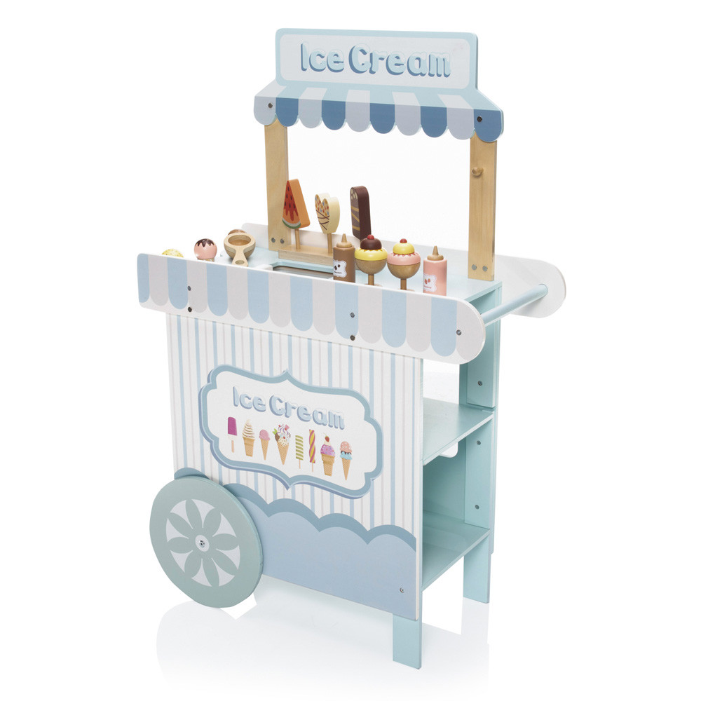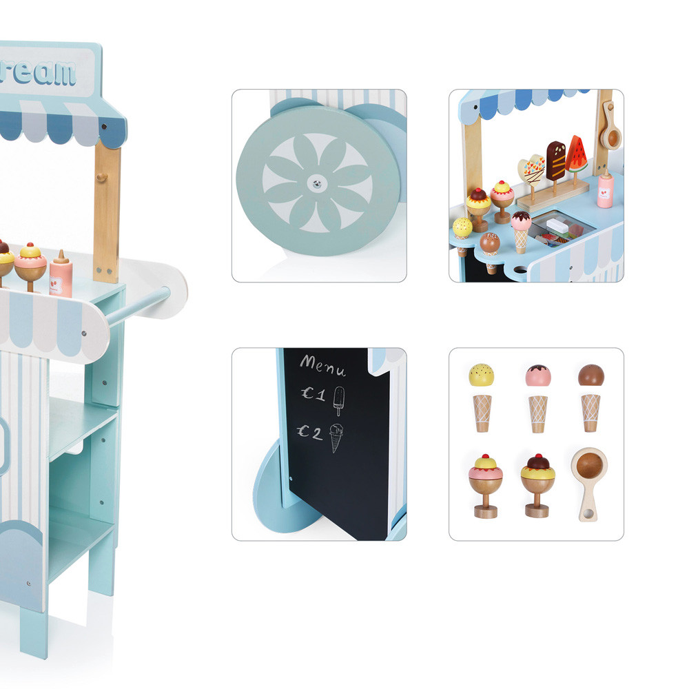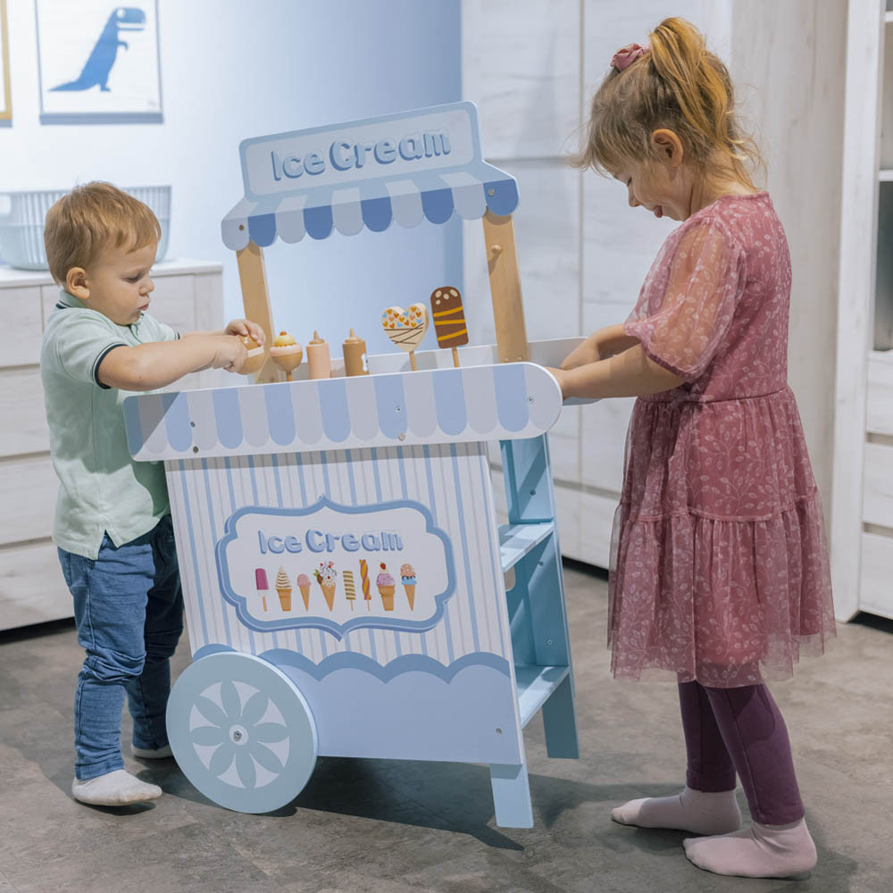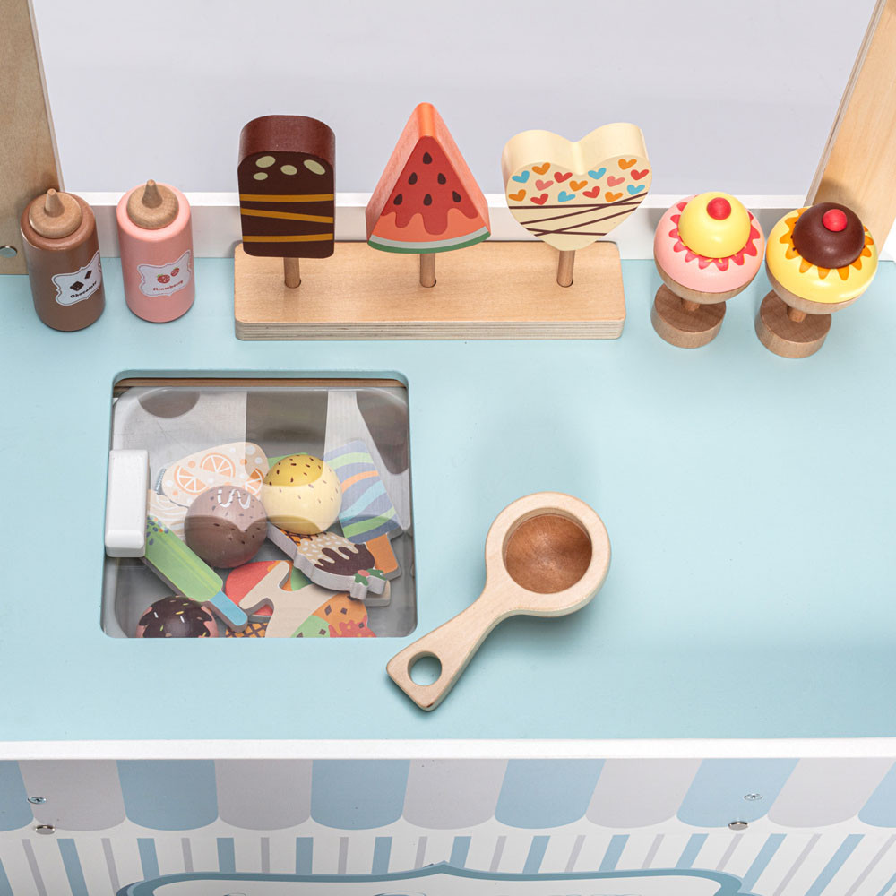 Mostantól gyermekei nem csak nyáron élvezhetik a finom fagylaltot. Ezt a kifinomult és színes készletet úgy tervezték, hogy fejleszti a kreativitást, a képzelőerőt és ösztönözze a játékos szerepjátékokat. A gyönyörűen feltuningolt fagylaltozóra emlékeztető kocsi készen áll arra, hogy elinduljon egy utazásra a gyermeki képzelet világába. A gyerekek imádni fogják autentikus kialakítását és egyszerű kezelőszerveit. A gyerekek élvezhetik az igazi fagylaltkészítő szerepét egy szeletelő eszközzel, amellyel tökéletes és ínycsiklandó adagokat készíthetnek kedvenc fagylaltjukból. A készlet tartalmaz egy fagyasztódobozt is, amely játékként is funkcionál, és segít a gyerekeknek úgy tenni, mintha a fagylaltjuk mindig friss és hűvös lenne.Fából készült fagylaltozónk remek módja a gyerekek fantáziájának és kreativitásának fejlesztésének, és bár ellenállhatatlanul szórakoztatja őket, Ön is kényeztetheti magát egy pillanatra önmaga számára. Készüljön fel számtalan órányi szórakoztató és ízletes kalandra kis fagylaltkészítőivel!- 3 éves és annál idősebb gyermekek számára alkalmas- Ösztönzi a képzeletet- Fejleszti a szociális készségeket- Papírpénzt tartalmaz- Kelyhek, tölcsérek, fagylalt gombócok- Fagylalt kanalak- Fagyasztó doboz- Méretek 66,5 × 32 × 101 cm- Strapabíró fából készült- Nem mérgező színek- Összesen 24 tartozék- Lehetővé teszi több gyermek egyidejű játékát- Bátorítja az interakciót és a szocializációt, amikor több gyermek játszik egyszerre- Remek ajándék tipp