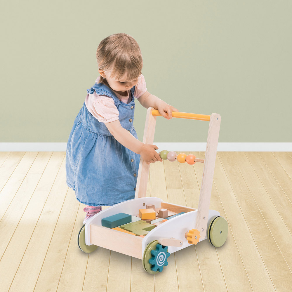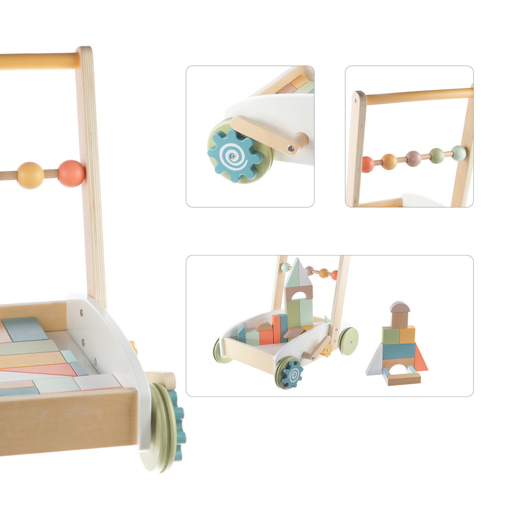 A képzeletnek nincs határa. A fa járássegítő kiskocsi tele van sokszínű kockákkal, amelyekből a gyerek bármit megépíthet. Ha a kockákat eltávolítjuk a kocsiból, akkor más játékok szállítására is használható. A tolókar fából készült golyókkal van ellátva, amelyek egyik oldalról a másikra mozgathatók. A tartós kerekek bármilyen típusú padlót képesek kezelni. A játék fejleszti a koordinációt, a motoros készségeket és a térbeli képzelőerőt.- Kocsi színes kockákkal- Kompakt méretek- Hosszú ideig szórakoztatja gyermekét- Fejleszti a motoros készségeket, a koordinációt és a térbeli képzelőerőt- Tartós fából és vízbázisú festékekből készült