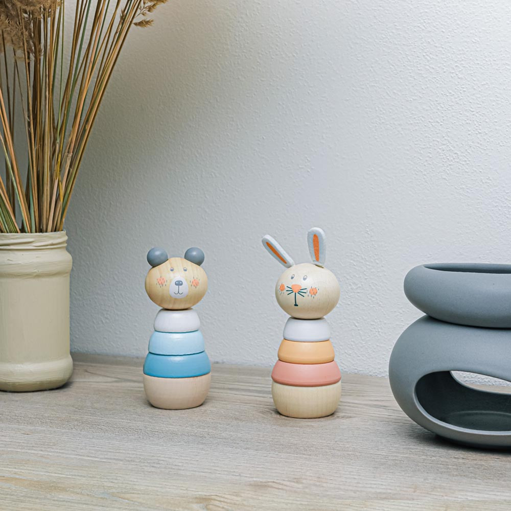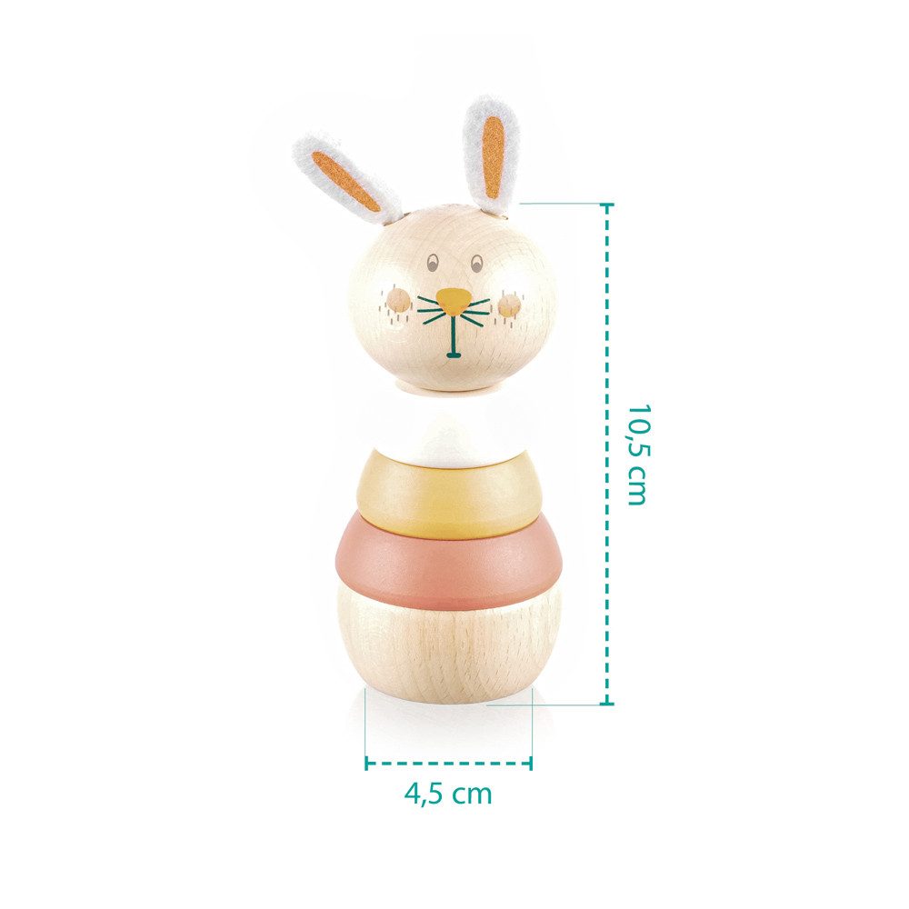 Az egymásra rakható játék egy fadarabokból álló készlet, amely szétszedhető és összerakható. A figura aranyos kialakítása magával ragadja a gyermeket, és játékos formában segíti a motoros készségek és a térbeli gondolkodás fejlesztését. A gyermek megtanulja a méretek felismerését és az alapvető számolást is. A játék kiváló minőségű bükkfából készült és vízbázisú festékekkel van festve.- Aranyos design- Különböző méretű fadarabok készlete- Fejleszti a motoros készségeket és a térbeli gondolkodást- Tartós bükkfából és vízbázisú festékekből készült- Mérete: kb.: 10,5 x 4,5cm