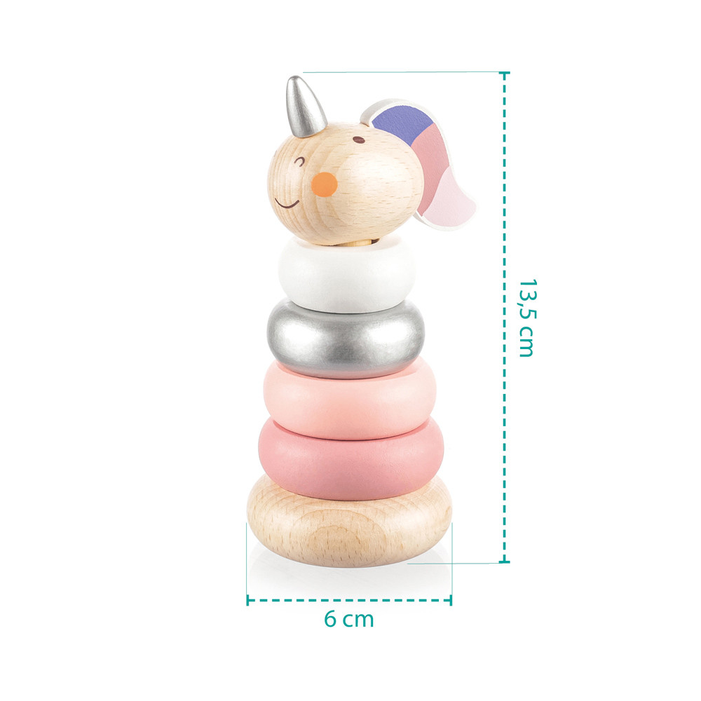 Az egyszarvú szett különböző méretű fadarabokból áll, melyek tetszés szerint kiszedhetők és visszarakhatók. Az egyszarvú dizájn vonzza a gyerekeket, és egyúttal segíti őket a motoros készségek és a térbeli gondolkodás fejlesztésében játék közben. A gyermek könnyen megtanulja az alapvető számolást és a méretfelismerést is. A játék kiváló minőségű és strapabíró bükkfából készült, az összes használt szín vízbázisú.- Aranyos unikornis design- Különböző méretű fadarabok készlete- Fejleszti a motoros készségeket és a térbeli gondolkodást- Tartós bükkfából és vízbázisú festékekből készült- Mérete: kb.: 13,5 x 6cm