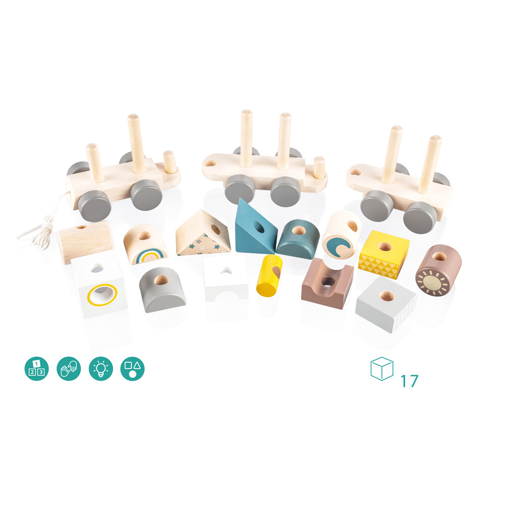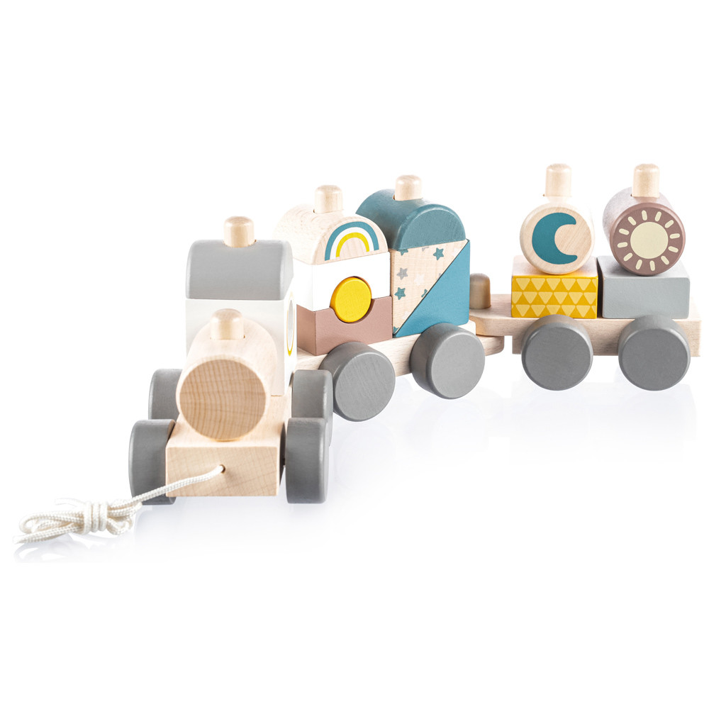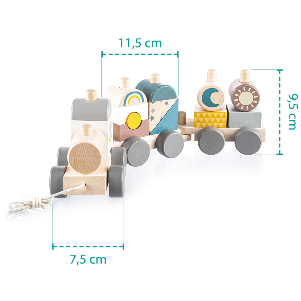 A színes vonatkészlet 14 darabból áll, amelyek végtelen mennyiségű szórakozást biztosítanak.Tetszőlegesen egymásra rakhatók, így különböző kocsikombinációkat hozhatunk létre. A vonat összeszerelésekor az elülső részében van egy madzag, aminek köszönhetően a gyermek maga mögött húzhatja.A játék támogatja a koordinációt, a finom-motorikát, a téri gondolkodást és a feladatmegoldó képességet. A vonat tartós bükkfából és vízbázisú festékekből készült.- Színes vonat kocsikkal- A kocsik különböző kombinációinak lehetősége- Madzag a vonat húzásához- Fejleszti a motoros készségeket, a koordinációt és az egyéni feladatok megoldási képességét- Természetes fából és vízbázisú festékekből készült- Mérete: kb.: 34,5 x 7,5 x 9,5cm
