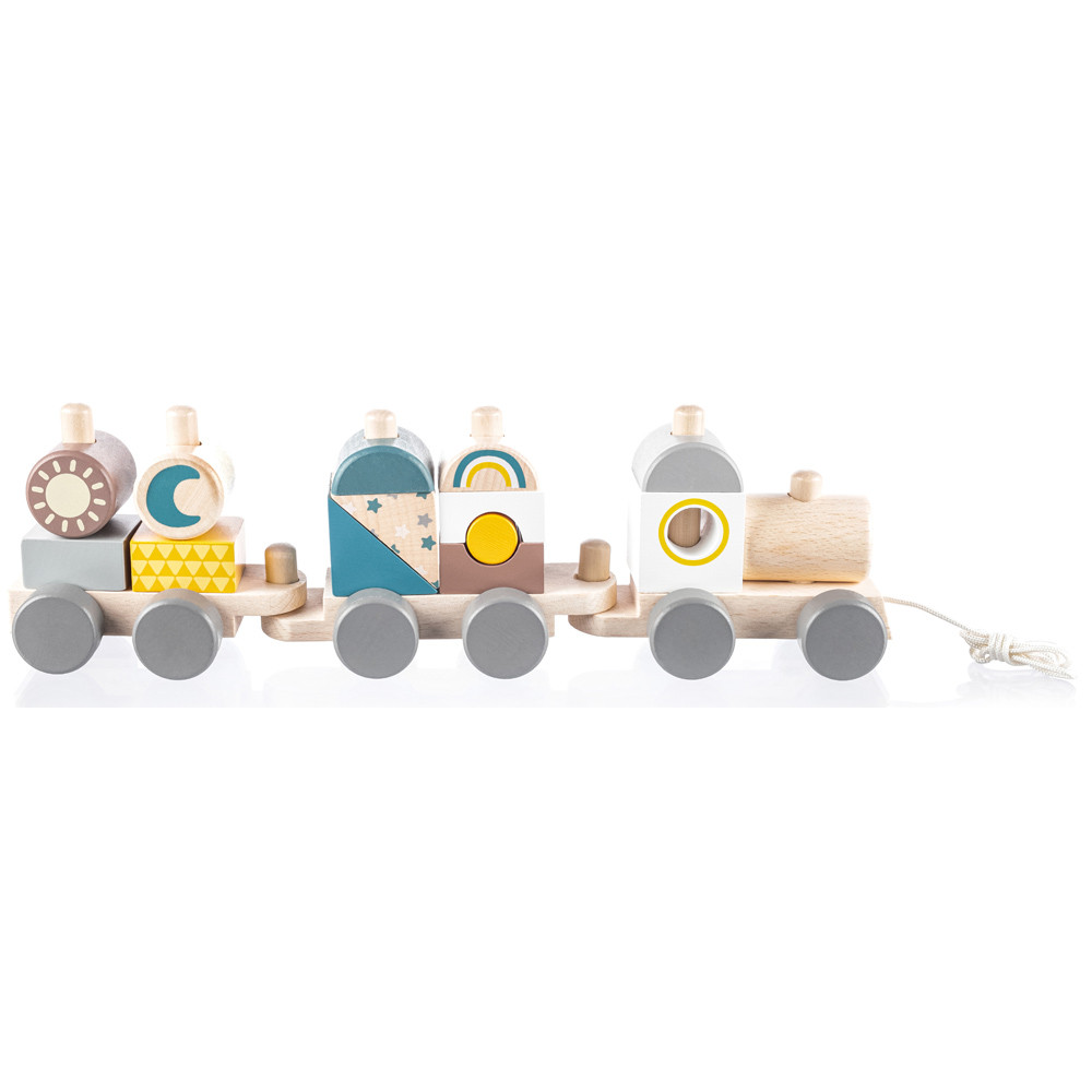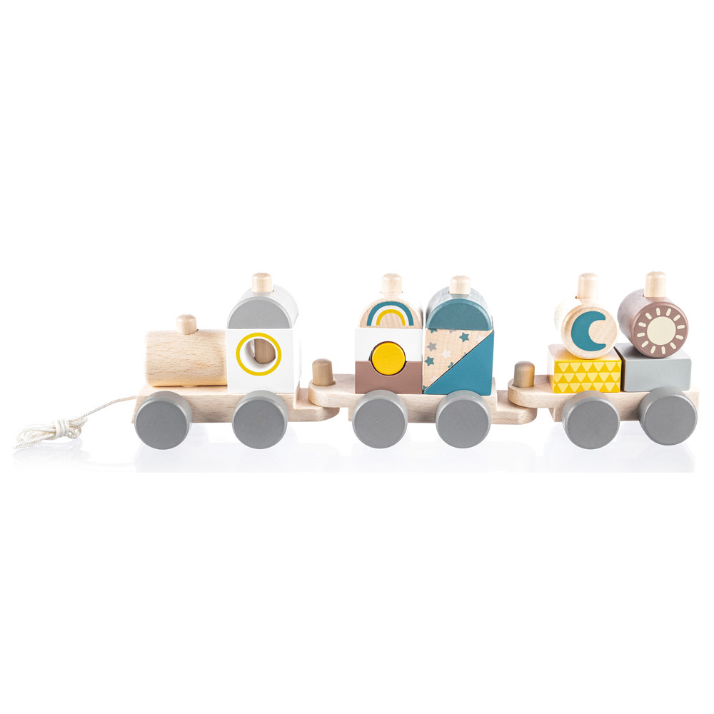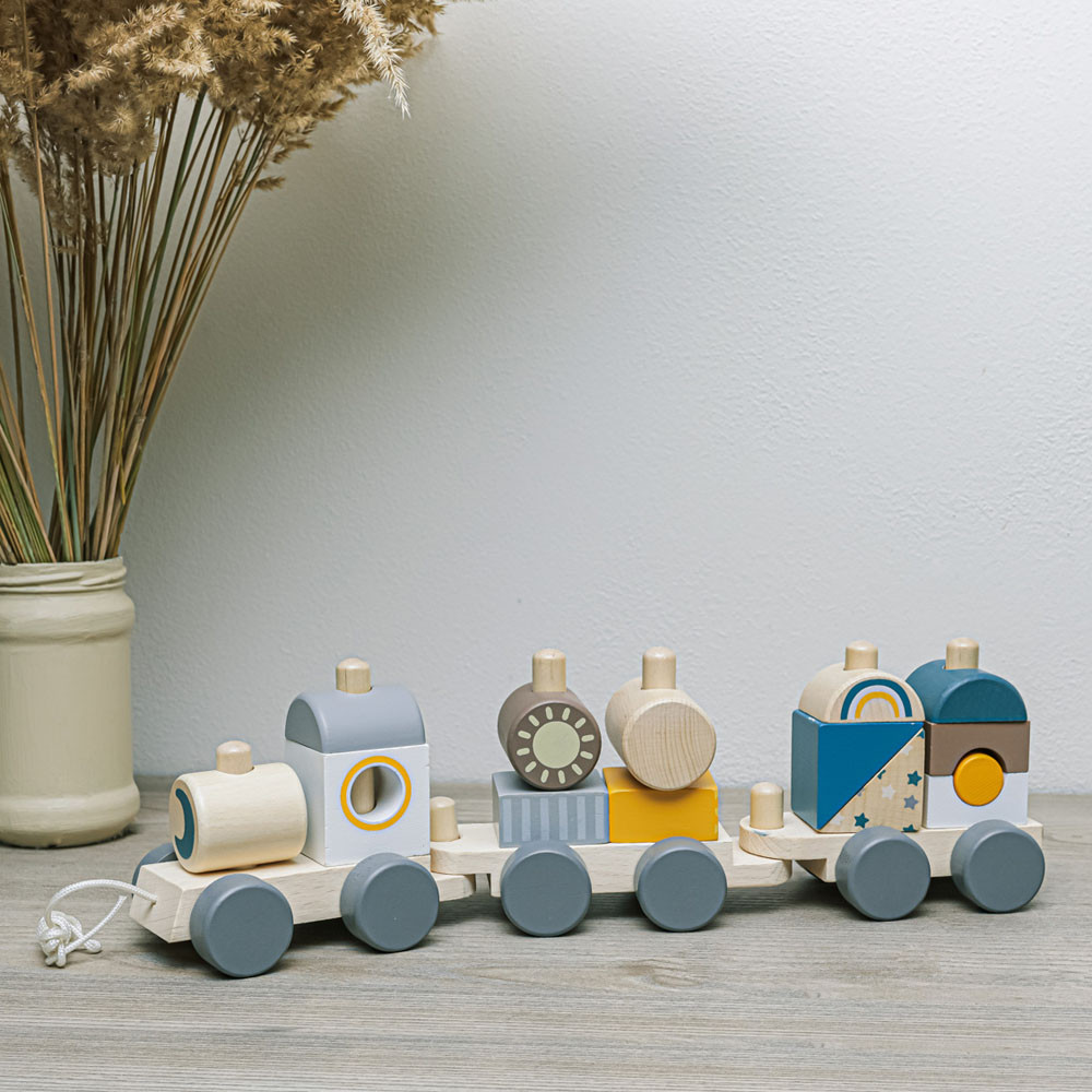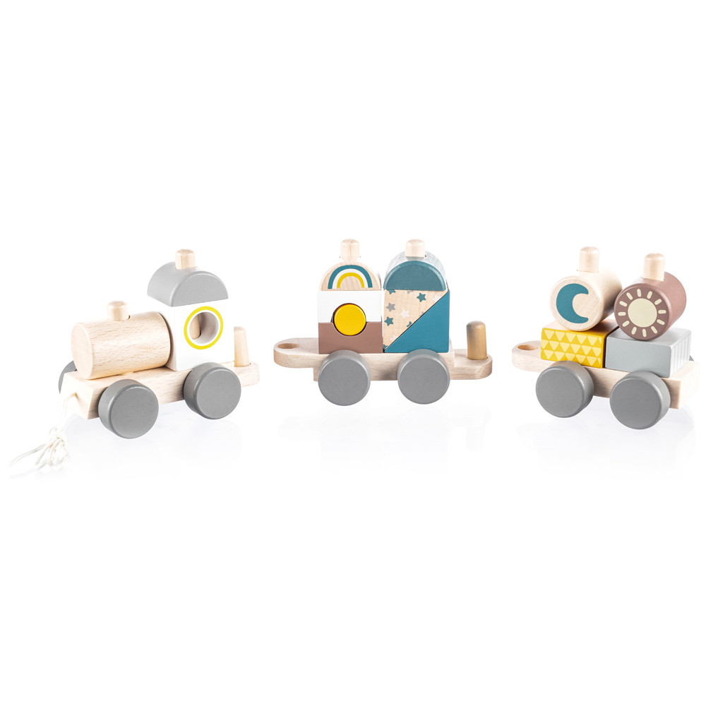 A színes vonatkészlet 14 darabból áll, amelyek végtelen mennyiségű szórakozást biztosítanak.Tetszőlegesen egymásra rakhatók, így különböző kocsikombinációkat hozhatunk létre. A vonat összeszerelésekor az elülső részében van egy madzag, aminek köszönhetően a gyermek maga mögött húzhatja.A játék támogatja a koordinációt, a finom-motorikát, a téri gondolkodást és a feladatmegoldó képességet. A vonat tartós bükkfából és vízbázisú festékekből készült.- Színes vonat kocsikkal- A kocsik különböző kombinációinak lehetősége- Madzag a vonat húzásához- Fejleszti a motoros készségeket, a koordinációt és az egyéni feladatok megoldási képességét- Természetes fából és vízbázisú festékekből készült- Mérete: kb.: 34,5 x 7,5 x 9,5cm