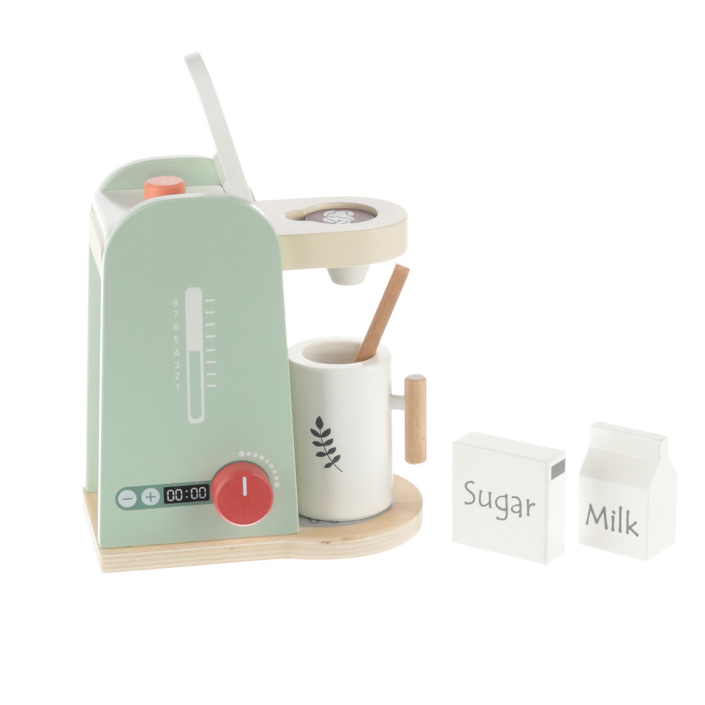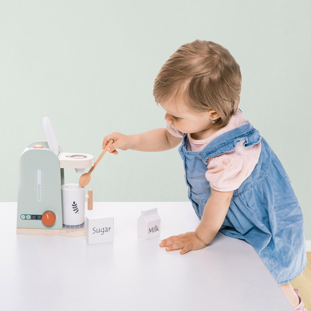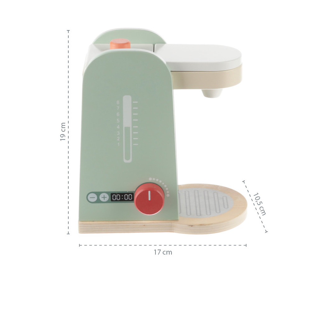A kifinomult, fából készült kávéfőző közvetlenül jó kávé elkészítésére hívja gyermekét. A kávéfőzőnek több gombja van, melyek forgathatók vagy megnyomhatók. Tartalmaz egy nagy fapoharat egy kanállal és a kávéfőzéshez szükséges hozzávalókat. A játék kiváló minőségű fából és vízbázisú festékekből készült.- Kávégép kialakítás- Kompakt méretek- Fejleszti a képzelőerőt és a finom-motorikát- Tartós fából és vízbázisú festékekből készült- Mérete: kb.: 19 x 17 x 10,5cm