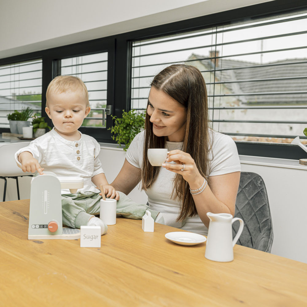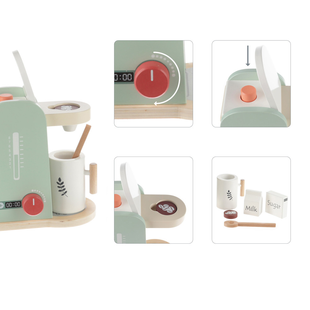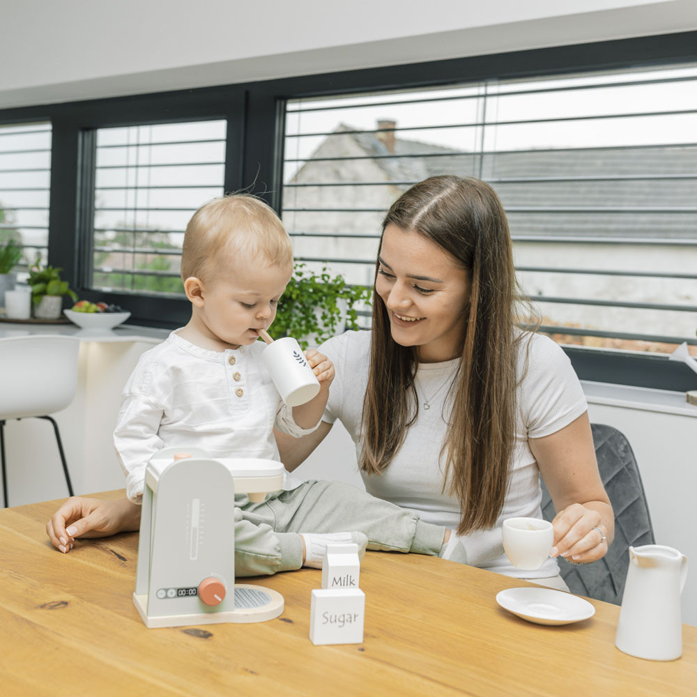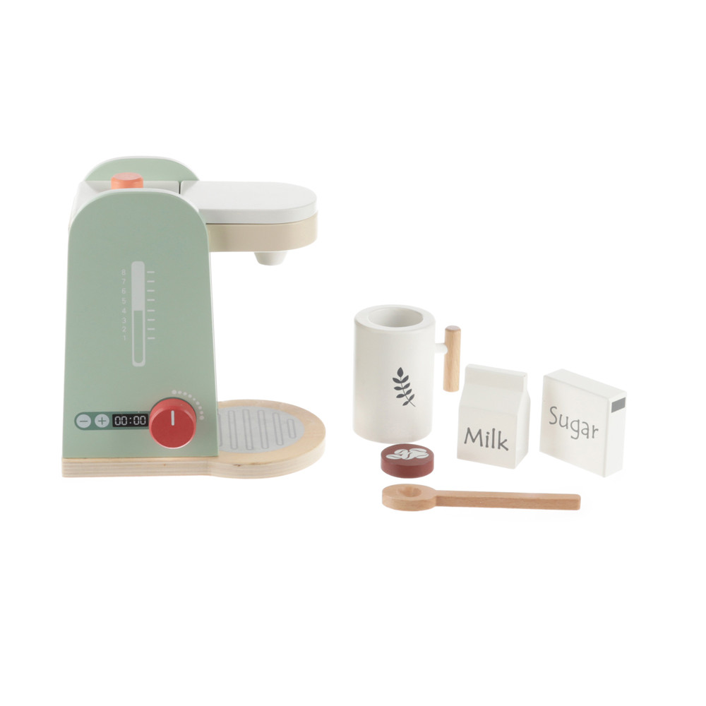 A kifinomult, fából készült kávéfőző közvetlenül jó kávé elkészítésére hívja gyermekét. A kávéfőzőnek több gombja van, melyek forgathatók vagy megnyomhatók. Tartalmaz egy nagy fapoharat egy kanállal és a kávéfőzéshez szükséges hozzávalókat. A játék kiváló minőségű fából és vízbázisú festékekből készült.- Kávégép kialakítás- Kompakt méretek- Fejleszti a képzelőerőt és a finom-motorikát- Tartós fából és vízbázisú festékekből készült- Mérete: kb.: 19 x 17 x 10,5cm