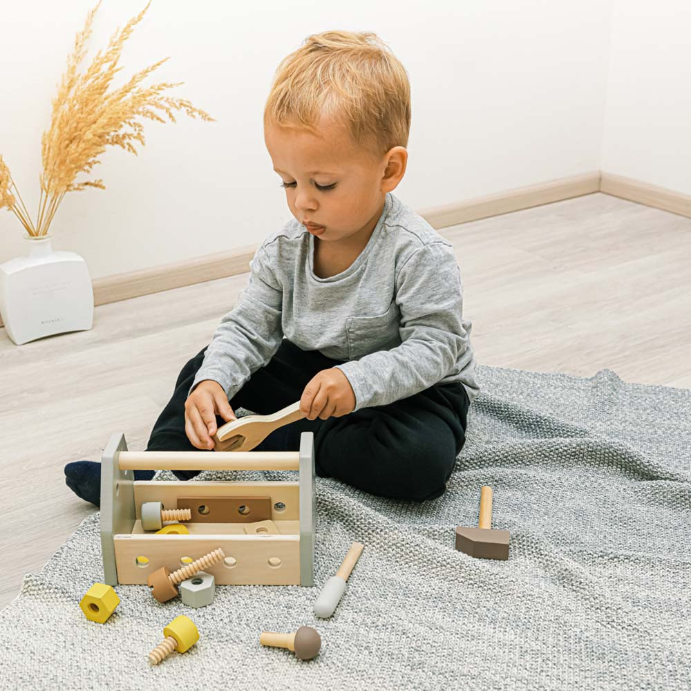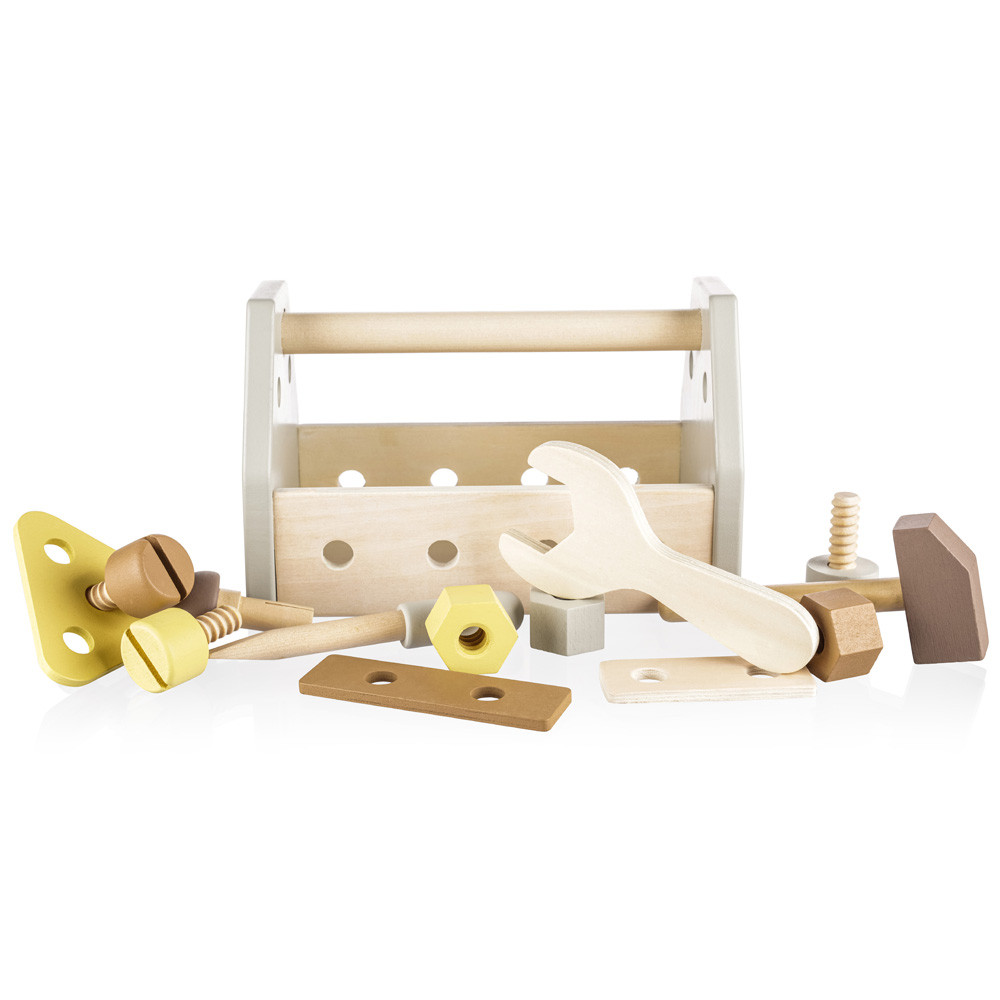A kis szakképzett építőknek szánt első szerszámkészlet tartalmaz egy kalapácsot, csavarhúzót, csavarkulcsot, 3 anyát, 3 csavart, 1 szöget, 3 fa alkatrészt és egy nagy dobozt, amelybe a játék minden alkatrésze elhelyezhető. A játék lehetőségei korlátlanok – a gyermek tud eszközöket készíteni és kezelni. Az eszköztár fejleszti a kreativitást, a motoros készségeket, a koordinációt, a rendezést és a problémamegoldó készségeket. A játék természetes bükkfából és vízbázisú festékekből készült.- Nagy készlet színes faszerszámok- Tartalmazza a kalapácsot, csavarhúzót, csavarkulcsot, anyákat, csavarokat, fa alkatrészeket és nagy dobozt- Fejleszti a kreativitást, a motoros készségeket és a problémamegoldó készségeket- Minőségi bükkfából és vízbázisú festékekből- Mérete: kb.: 20,5 x 13 x 11,5cm