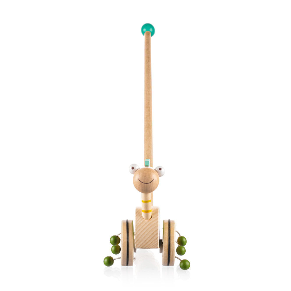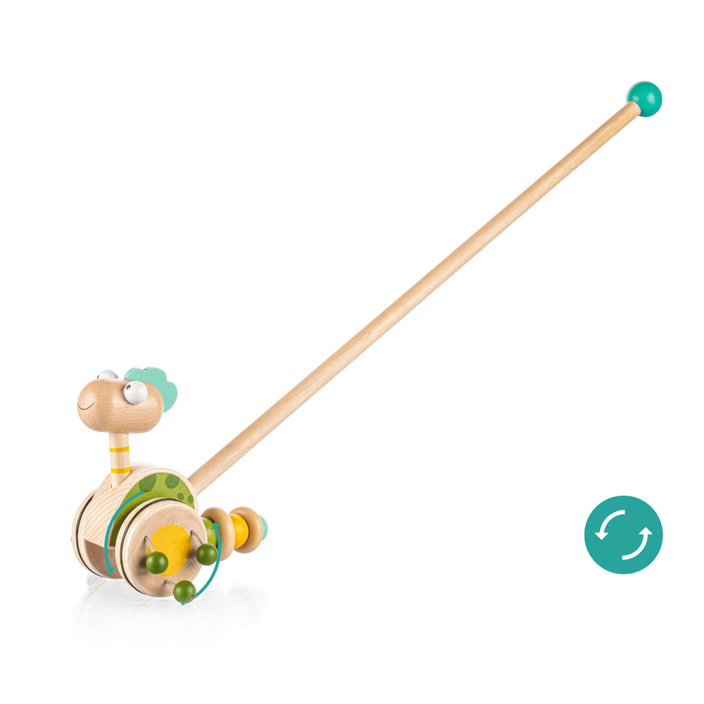 A hosszú rúdon lévő vicces dinoszaurusz mozgás közben forog, és a kerekekre erősített fagyöngyöknek köszönhetően olyan hangot ad ki, amely sétálásra csábítja a gyereket, és hosszú órákon át szórakoztat. Ezenkívül a rögzített rúd támaszként szolgál a gyermek első lépései során, és a végén egy fagolyóval van felszerelve a nagyobb biztonság érdekében. A játéknak nincsenek éles szélei, és tartós, hosszú élettartamú fából készült.- Aranyos dinoszaurusz kialakítás- A kerekeken lévő fagyöngyök mozgás közben hangot adnak- 48 cm hosszú fa rúd- Fejleszti a motoros készségeket- Járásra ösztönzi a gyermeket- Minőségi és tartós fából készült- Mérete: kb.: 56 x 7 x 5,5cm