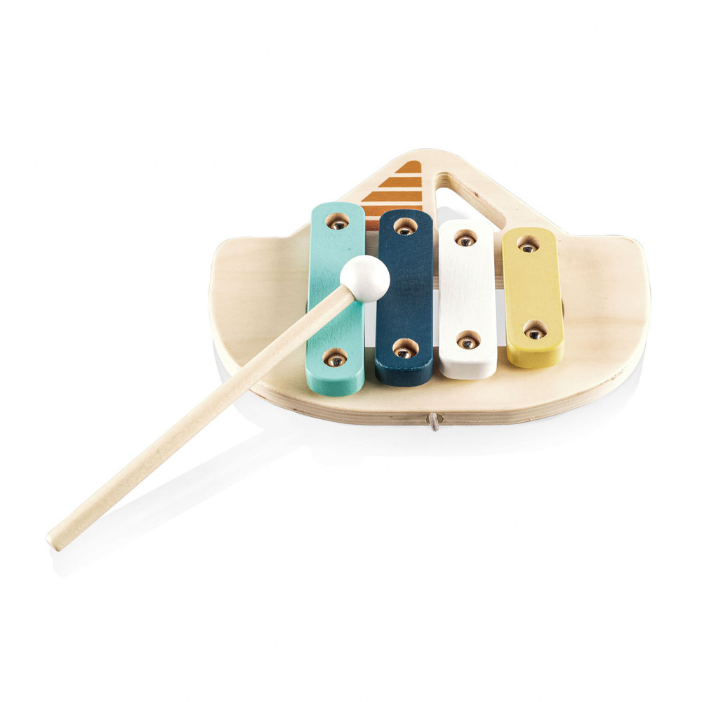 Egy aranyos, jármű alakú xilofon első látásra vonzza a kíváncsi gyerekeket. Az egyszerű kompakt formát praktikus fogantyú egészíti ki, melynek köszönhetően a játék könnyen megfogható és hordozható. A xilofon oldalára ügyesen van elhelyezve egy rugalmas gumi, amely a kalapács tárolására szolgál, és így megakadályozza annak elvesztését. A játék kompakt méretei ideálisak a kisgyermekek kezébe. Az alacsony súly garantálja a könnyű kezelést.A xilofon fejleszti a gyermek zenei hallását, aki ennek a játéknak köszönhetően megismeri az első hangokat és dallamokat. Remek eszköz a motoros készségek, a képzelet és a kreativitás fejlesztésére is. Természetes fából és vízbázisú festékekből készül.- 18 hónapos kortól alkalmas gyermekek számára- 4 hang- Fogantyú a könnyű hordozáshoz- Erős gumiszalag a kalapács rögzítéséhez- Minőségi fából készült- Fejleszti a gyermekek motorikus készségeit, zenei hallását, ritmusérzékét és kreativitását- Mérete: kb.: 18 x 15 x 1cm