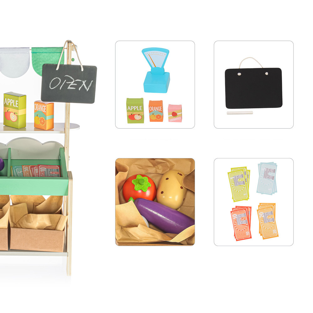 Készítse el saját piacát közvetlenül gyermeke szobájában ezzel a varázslatos fából készült gyümölcs- és zöldségállvánnyal. Ez az autentikus bódé úgy néz ki, mint egy igazi piac, és mind a lányoknak, mind a fiúknak örömet okoz. A gyerekek jól érezhetik magukat a gyönyörű gyümölcsök és zöldségek eladásával a kis boltjukban.A fából készült bódé strapabíró fából készült, és szövet napellenzővel rendelkezik, amely egy igazi piactér hangulatát kelti. Gyermekei saját piacteret alakíthatnak ki a nappaliban vagy a teraszon, ahol kedvenc fajátékaikkal és finomságaikkal bővíthetik a választékot.Gyermekei szeretnek boltokban és piacokon vásárolni? Ezzel a fabódéval otthon is ugyanazt a szórakozást nyújtja nekik. A tartós fa kialakításnak és a biztonságos vízbázisú festéknek köszönhetően a gyerekek és barátaik sok-sok mókát és élvezetes időt tölthetnek el.A bódé egy táblával van felszerelve, amelyre a gyerekek krétával felírhatják az árakat és a napi ajánlatokat, vagy maguk határozhatják meg, hogy a stand nyitva vagy zárva van-e. A képzeletnek nincs határa, a gyerekeknek rengeteg kalandban lesz része a kereskedés során. A bódéban három fadoboz található, amelyek úgy néznek ki, mint egy zöldségestől származó valódi doboz, valamint több fából készült gyümölcs és zöldség.Ez a kisbolti készlet kartondobozokat is tartalmaz papírral a kényelmes vásárláshoz, mérleget, bevásárlólistát és pénzt. A készlet paradicsomot, burgonyát, padlizsánt, banánt és egyéb gyümölcsöket és zöldségeket is tartalmaz, így nem kell mást vásárolni. Gyermekei azonnal elkezdhetnek játszani, és megtapasztalhatják a kereskedés örömét.- 3 éves és annál idősebb gyermekek számára alkalmas- Ösztönzi a képzelőerőt és a koordinációt- Formákat, színeket, számolást és térérzékelést tanít- Bevásárlólista és pénz is benne van- Karton dobozok mellékelve- Mérleg mellékelve- Gyümölcsök és zöldségek- Strapabíró fából készült- Nem mérgező festék- Csomagolásonként 37 db- Lehetővé teszi több gyermek egyidejű játékát- Bátorítja az interakciót és a szocializációt, amikor több gyermek játszik egyszerre- Remek ajándék tipp- Mérete: kb.: 50 × 45 × 21cm