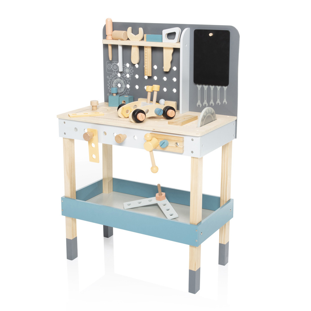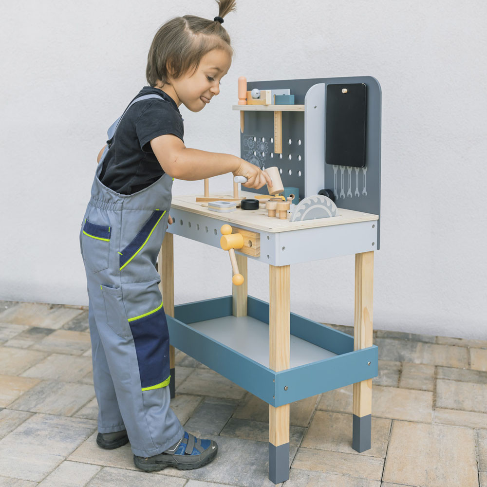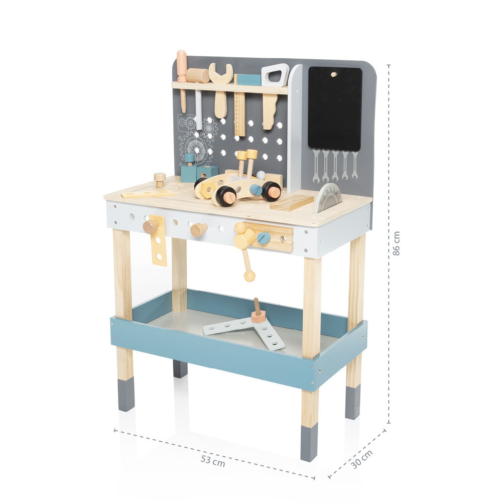 Tágas munkapad, amely nem hiányozhat egyetlen gyerekműhelyből sem. A munkapad egy nagy táblát tartalmaz kör alakú lappal, amelyen különféle alkatrészek találhatók - a falemezektől a csavarokon át az anyákig. Az asztal alatt van egy tárolóhely. Tartalmaz egy lyukakkal ellátott polcot fakalapács, mérőszalag és fűrész felakasztására. A munkapad minőségi fából és vízbázisú festékekből készül. Fejleszti a motorikus készségeket és a képzeletet.- Tágas munkapad- Faszerszámokat és alkatrészeket tartalmaz- Hosszú ideig szórakoztatja gyermekét- Fejleszti a motoros készségeket, a koordinációt és a térbeli képzelőerőt- Tartós fából és vízbázisú festékekből készült- Mérete: kb.: 86 x 53 x 30cm