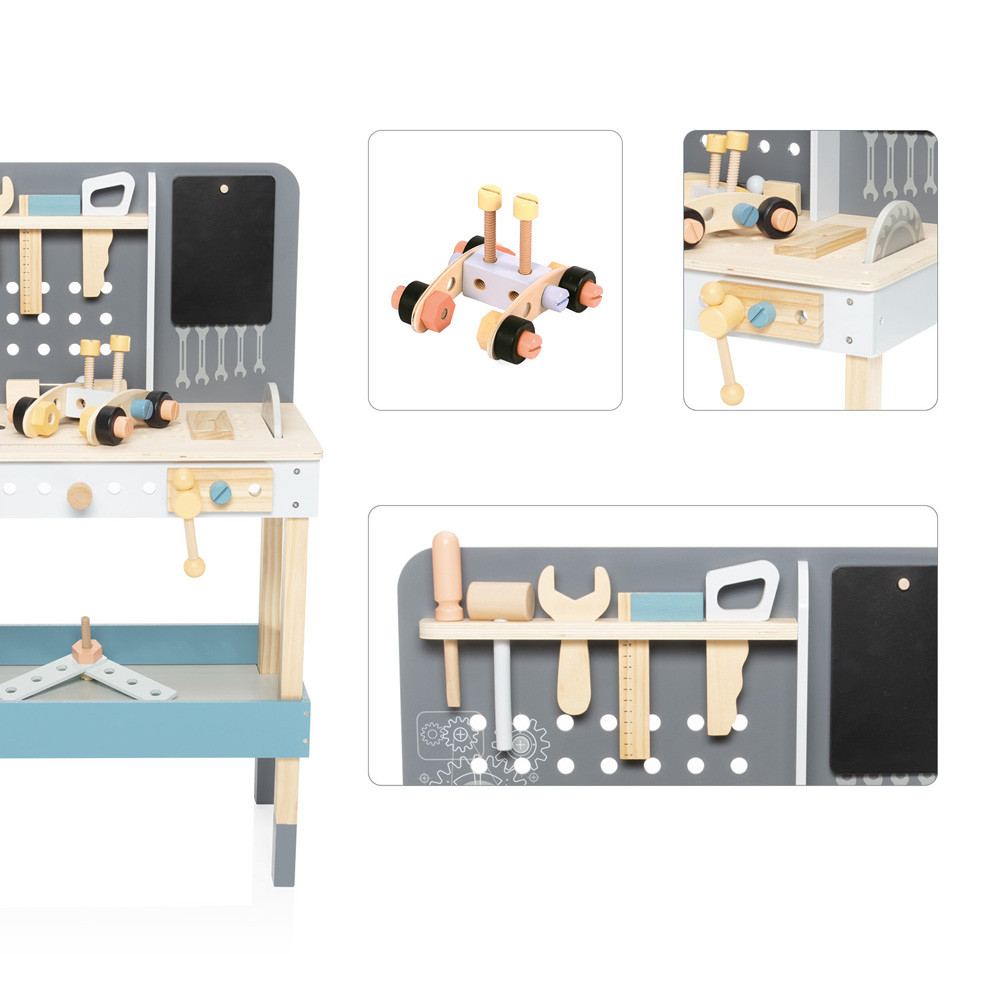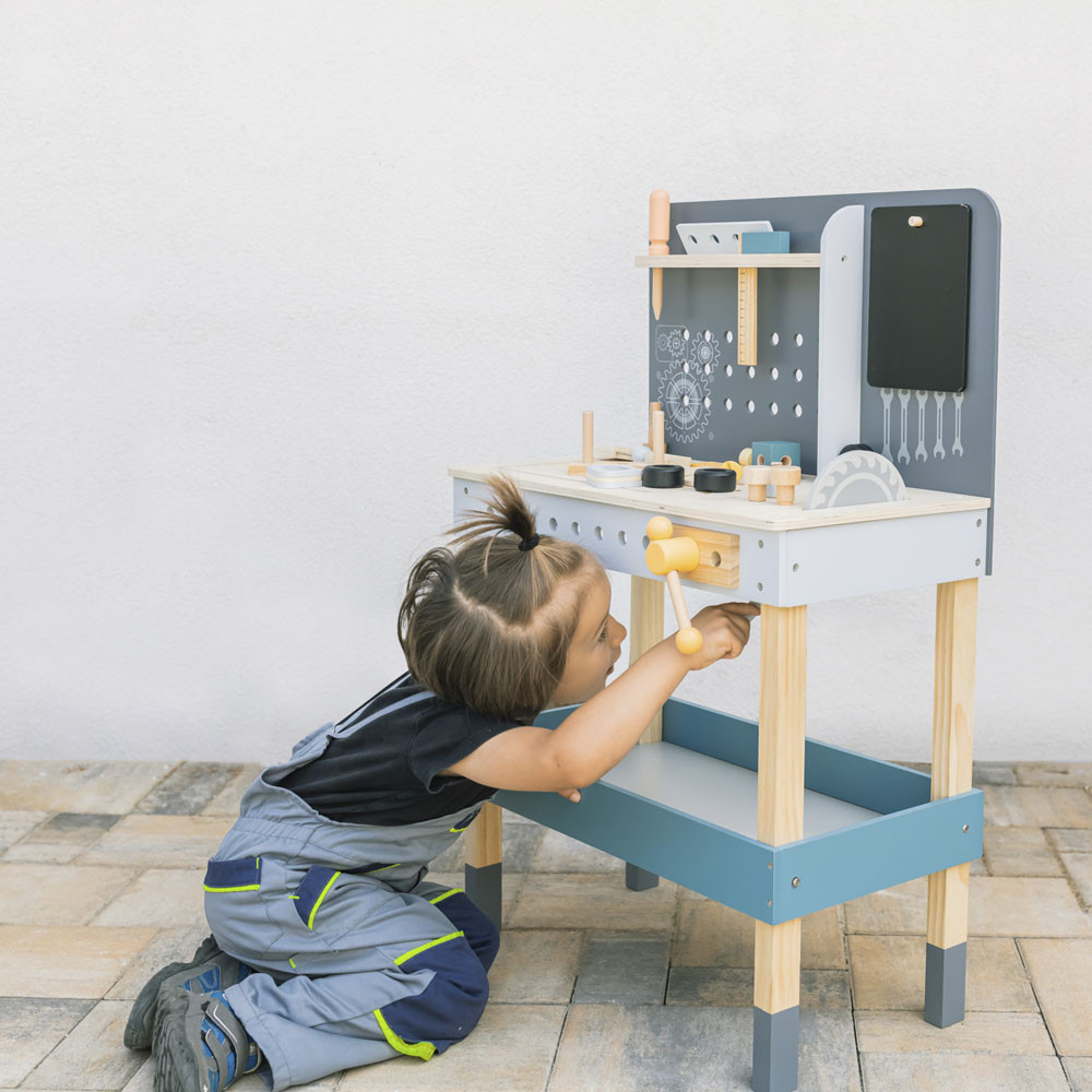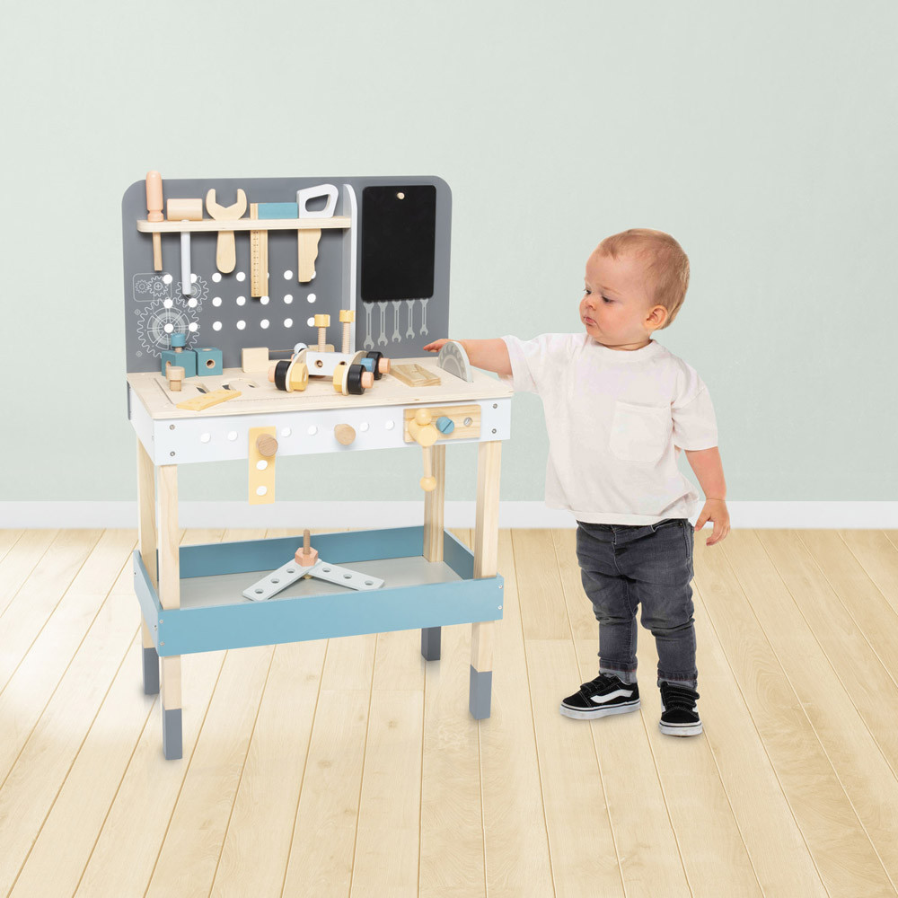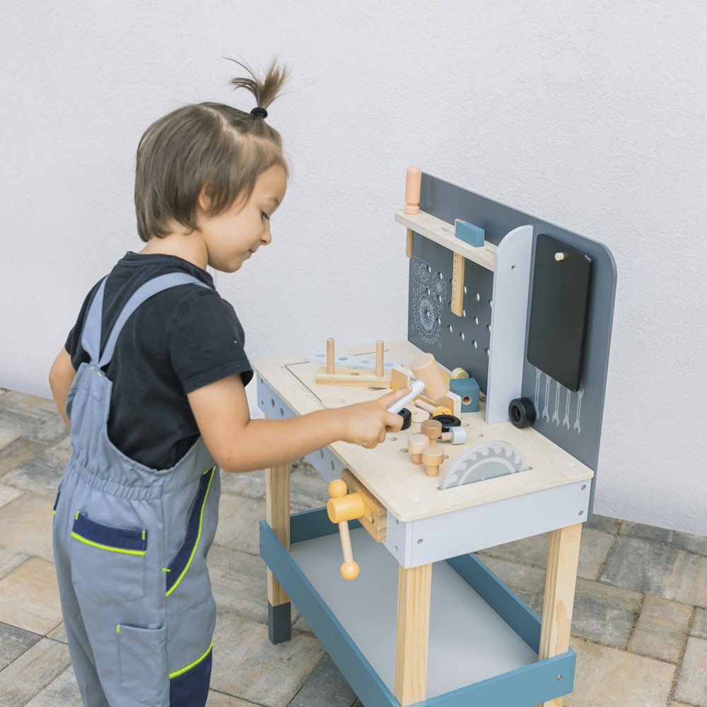 Tágas munkapad, amely nem hiányozhat egyetlen gyerekműhelyből sem. A munkapad egy nagy táblát tartalmaz kör alakú lappal, amelyen különféle alkatrészek találhatók - a falemezektől a csavarokon át az anyákig. Az asztal alatt van egy tárolóhely. Tartalmaz egy lyukakkal ellátott polcot fakalapács, mérőszalag és fűrész felakasztására. A munkapad minőségi fából és vízbázisú festékekből készül. Fejleszti a motorikus készségeket és a képzeletet.- Tágas munkapad- Faszerszámokat és alkatrészeket tartalmaz- Hosszú ideig szórakoztatja gyermekét- Fejleszti a motoros készségeket, a koordinációt és a térbeli képzelőerőt- Tartós fából és vízbázisú festékekből készült- Mérete: kb.: 86 x 53 x 30cm