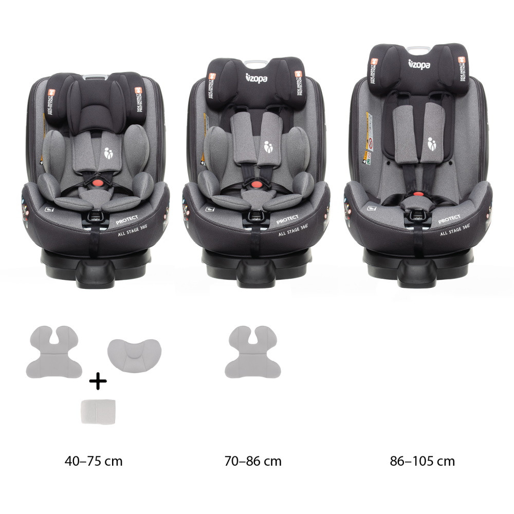 Zopa Protect i-Size gyerekülésKorosztály: Újszülött kortól kb. 4 éves korigTestmagasság: 40-105 cmRögzítés: Isofix-szel menetiránynak háttal és menetirány szerint isMegfelel az ECE R 129 i-Size szabványnak- 360°-os elforgathatóság- Menetiránynak háttal: újszülött kortól 105 cm-es testmagasságig- Menetirány szerint: 76 cm-es testmagasságtól 105 cm-es testmagasságig- Egy kézzel forgatható (központi zár)- 5 dőlésszög menetiránynak háttal és menetirány szerint is- Rögzítés a járműbe Isofix-szel és támasztólábbal- Modern dizájn és erős, tartós anyagok- Minőségi párnázás- Újszülött betét- A fejtámla kiváló minőségű EPP anyagból és PU habból készül a maximális biztonság érdekébenA Protect gyerekülés születéstől 4 éves korig (40-105 cm) védelmet nyújt a gyermekek számára, és amellett, hogy maximális biztonságot nyújt, kényelmes kezelést biztosít. Az autósülés rögzítése a támasztóláb és az Isofix segítségével történik. A szülők is értékelni fogják a 360°-ban elforgatható opciót, amely a sokak által kedvelt beszállási pozíciót biztosítja. Ez nem csak megkönnyíti a gyermek beültetését az ülésbe, hanem megkönnyíti a becsatolást és a biztonsági övek megfelelő megvezetésének és meghúzásának ellenőrzését is. A Protect biztonsági gyermekülés ugyanazt a reteszelő mechanizmust használja az ülés elforgatásához, mint a döntéséhez. Így egy kézzel is könnyedén forgathatja.A maximális oldalsó ütközésvédelem érdekében a kényelmes fejtámla nem törékeny polisztirolból (EPS), hanem kiváló minőségű expandált polipropilén EPP és PU habból készült. Biztos lehet benne, hogy mindent megtett annak érdekében, hogy babája biztonságban legyen útközben.A Protect autósülés a menetiránynak háttal való használat teljes időtartama alatt használható, ami születéstől 4 éves korig terjed. Menetirány szerint rögzítve 76 cm-es testmagasságtól használható. Gyermeke maximális biztonsága érdekében azonban azt javasoljuk, hogy az ülést ameddig csak lehetséges, menetiránynak háttal használja.A gyermekkel való utazás nem csak a biztonságról szól, hanem arról is, hogy a gyermek kényelemben legyen, különösen pihenés és alvás közben. Ezért a Protect autósülés dönthető: 10 pozíciót kínál, 5 menetirány szerinti és 5 menetiránnyal ellentétes helyzetet. Ezenkívül az ülés újszülött betéttel van felszerelve, amely két részből áll, hogy a lehető legjobban alkalmazkodni tudjon a gyermek igényeihez és tényleges szükségleteihez.