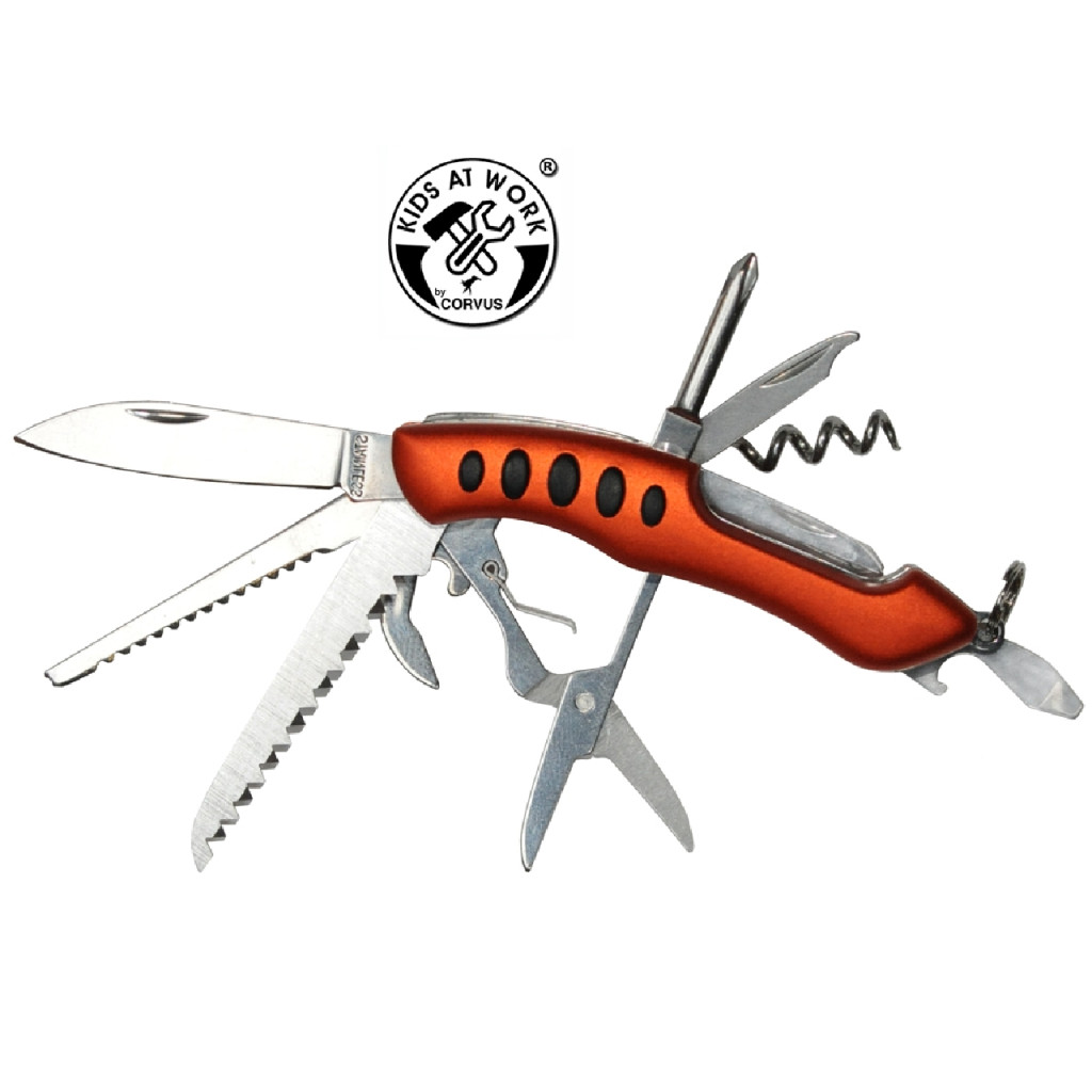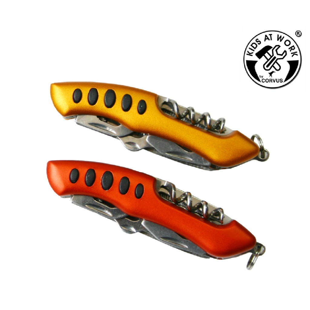 Olló, konzervnyitó, fűrész, késpenge, palacknyitó, dugóhúzó, csillag csavarhúzó, reszelő, lyukasztó, haltisztító, körömtisztító, fogpiszkáló, csipesz. Jó fogású műanyag nyéllel, csúszásgátló gumibetétekkel.