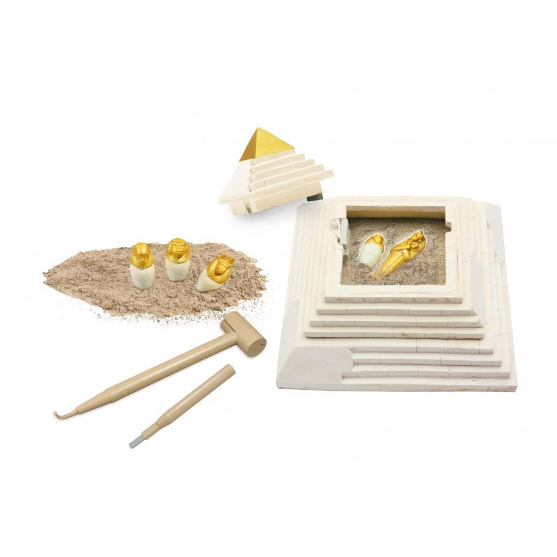 • Piramis modell: A játék tartalmaz egy részletes piramis modellt, amelyet a gyerekek maguk építhetnek meg. Ez fejleszti a térlátást és a kézügyességet.