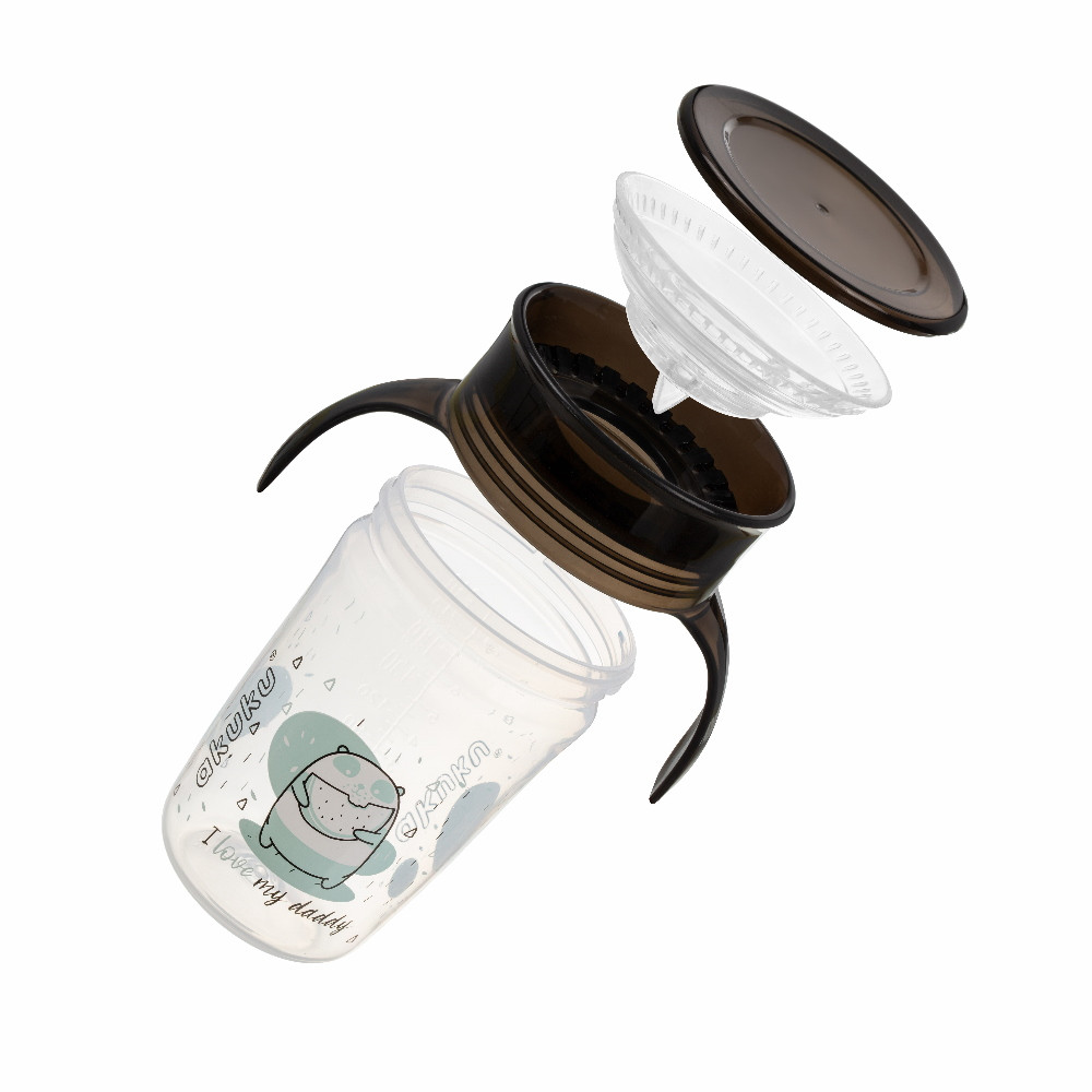 A 360˚-os kiömlésmentes itatópoharat úgy tervezték, hogy a gyermek mielõbb megtanuljon inni. A folyadék kiömlésének megakadályozása érdekében tömítõszeleppel van felszerelve. A szájrész lehetõvé teszi, hogy annak bármely részérõl ihasson a gyermek. A kényelmes és széles fogantyúk és az ergonomikus forma megkönnyíti a pohár kézben tartását. A kupak véd a szennyezõdésektõl. Könnyû és gyors mosás. Mosogatógépben mosható.