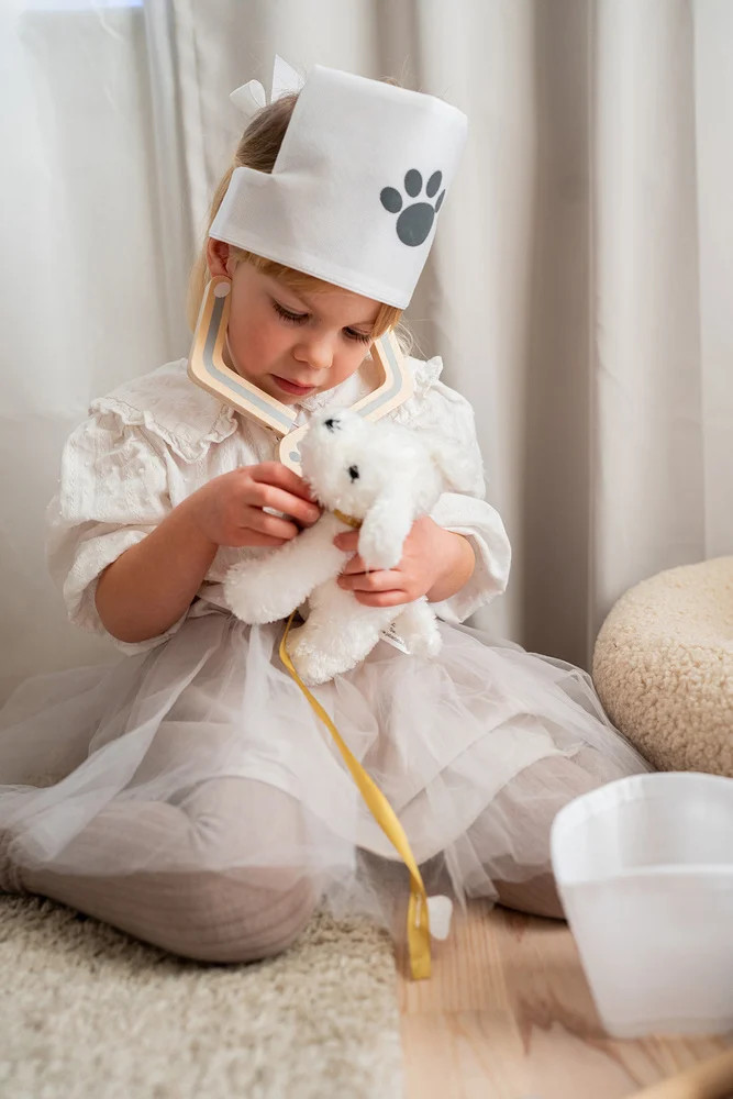 • Valósághű eszközök: A készlet tartalmaz sztetoszkópot, fecskendőt, lázmérőt, kenőcsöt és egyéb orvosi eszközöket, amelyek segítségével a gyermekek élethűen eljátszhatják az állatorvosi szerepet. Ez fejleszti a finommotoros készségeket és a kézügyességet.