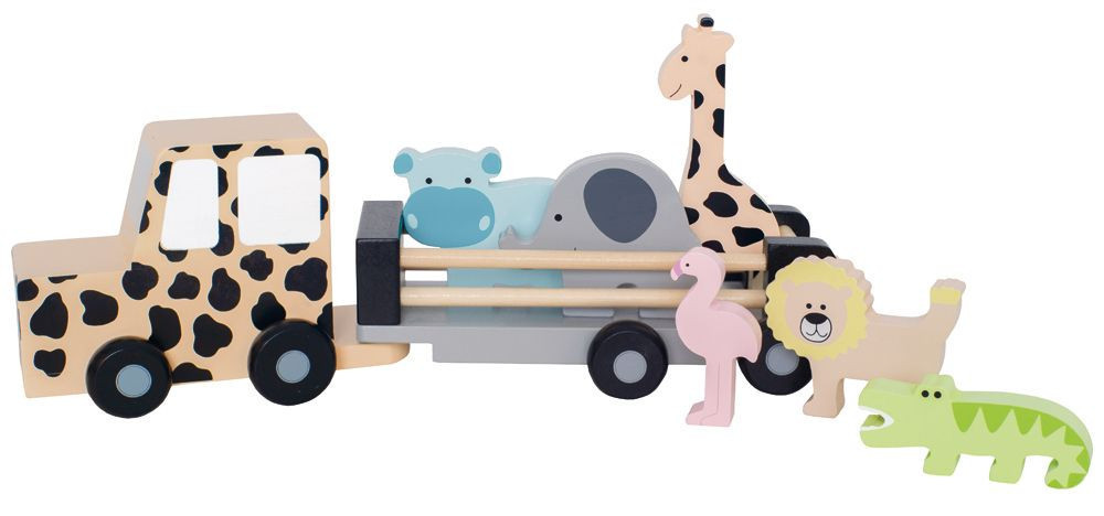• A csomag tartalma: 1 db fa dzsip, 4 db állatfigura (oroszlán, elefánt, zsiráf, zebra)