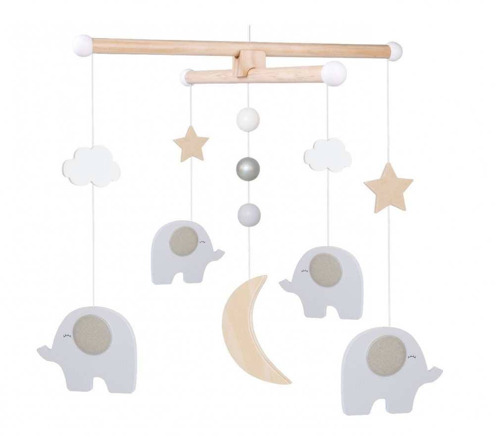 Aranyos fa ágyforgó, mely a kiságy fölé vagy a pelenkázó asztalhoz is fellógatható a gyerekszobában. Az ágyforgón imádnivaló elefántok, felhők és gömbök találhatók. A játék színei és mintái segítenek stimulálni a gyermek érzéseit és mozgását az első hónapokban.